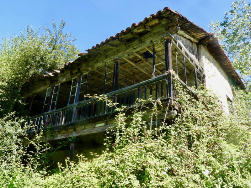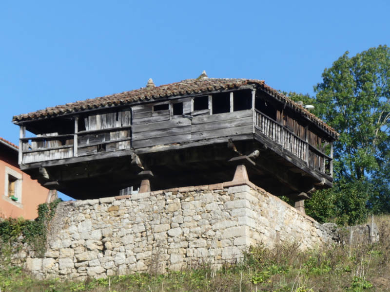 Op de foto rechts zie je een houten graanschuur, een hórreo, hij staat op houten palen om knaagdieren geen kans te geven de voorraad te bereiken, boven op de steunpaal zit daarom een platte steen.