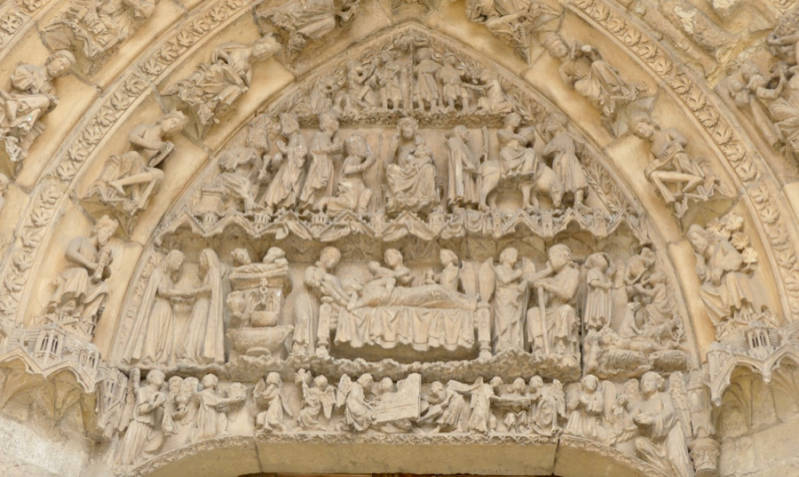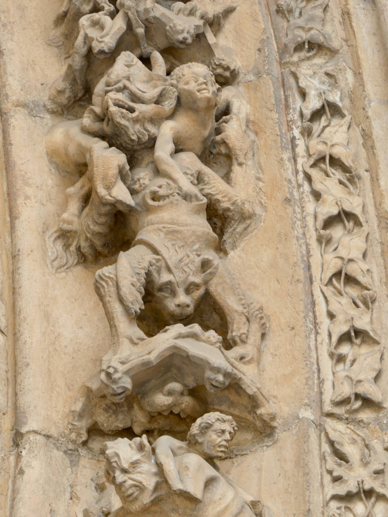 Fragment van een van de 3 portalen van de kathedraal, onder een deel van het gotische beeld Virgin Blanca., de glimlachende Maagd. Daarboven 'Het laatste oordeel.'.