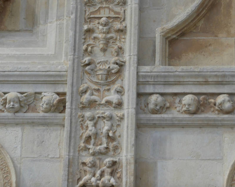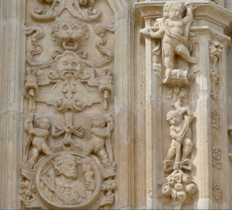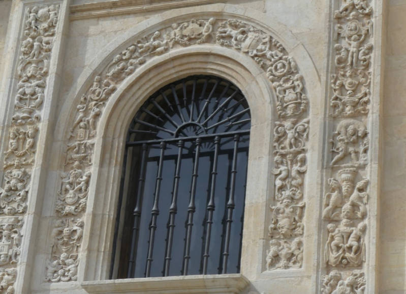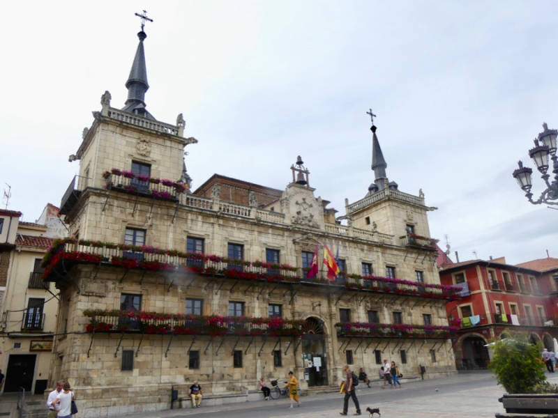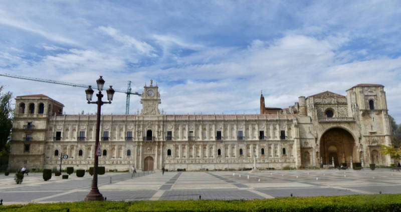 Wat dichter bij de camperplaats ligt een parador (staatshotel) uit de 16e eeuw, Hostal de San Marcos, gebouwd door koning Ferdinand. Oorspronkelijk was dit het hoofdkwartier van een militaire ridderorde. Het gebouw is opgetrokken in de Spaanse stijl van de late renaissance, plateresk genoemd, wat te zien is aan de rijk versierde gevel. Plateresk komt van plateros, zilversmeden, (plata is zilver) omdat de nauwkeurige manier van polijsten van de stenen oppervlakten deed denken aan de technieken die de zilversmeden ook toepasten. We hebben ons een tijdje staan te vergapen aan de gevel , wat een precisie werk.