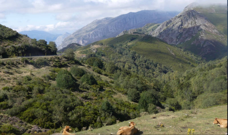 We zijn vanmorgen de bergen ingereden en staan nu 45 km onder Oviedo in het Parque Natural de las Ubiñas-la Mesa, onderdeel van het natuurreservaat Somiedo, er komen hier nog bruine beren voor. Doordat ze afgeschoten werden en door vernietiging van hun natuurlijke leefomgeving was hun aantal sterk teruggelopen maar sinds de jaren 90 is hun situatie weer aan het verbeteren. Er leven naar schatting nu 200 beren in Somiedo.