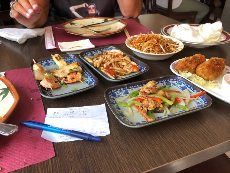 Eten bij de Japanner, hier oa kip reepjes, krabbenpoten,  spiesjes met vis/garnalen. En een briefje met de nummers van de gerechten die je wilt bestellen.