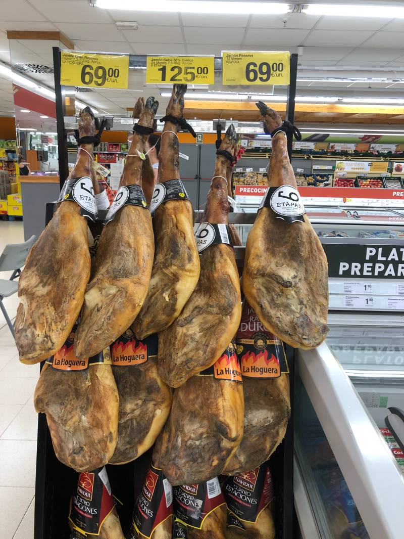 We hebben vandaag nog eens extra goed gekeken naar de hammen die bij de Consum hangen en die in de vitrines liggen. Er is een enorme keus aan kwaliteit en prijs, de duurste waren de jamon bellotas, van de vrije uitloop varkens die eikels hebben gegeten. Die kost maar liefst €19,90 per 100 gr, wij hebben er ooit in Extramadura €14,90 voor betaald. Lekker maar het geld niet waard vonden we.