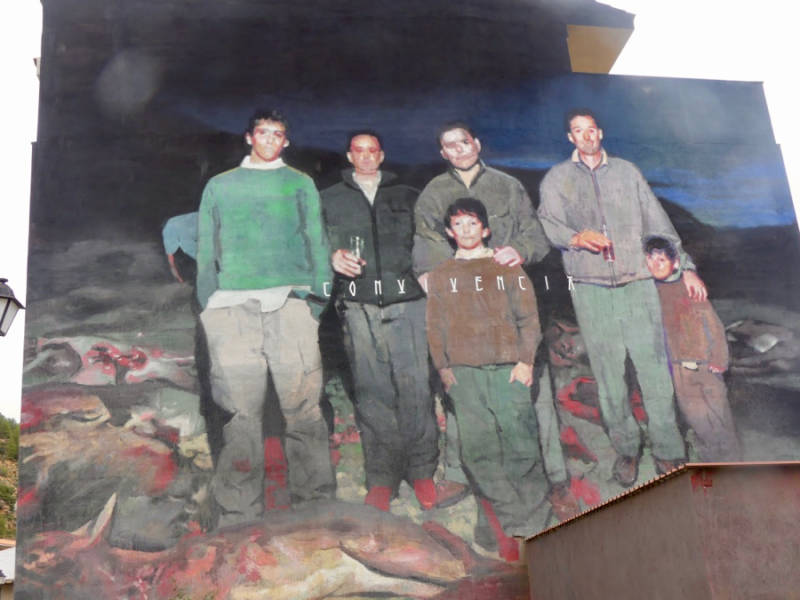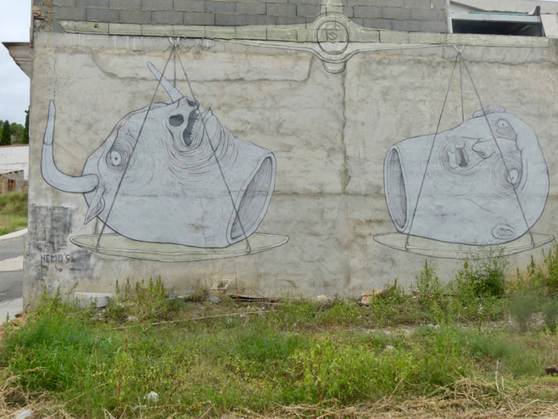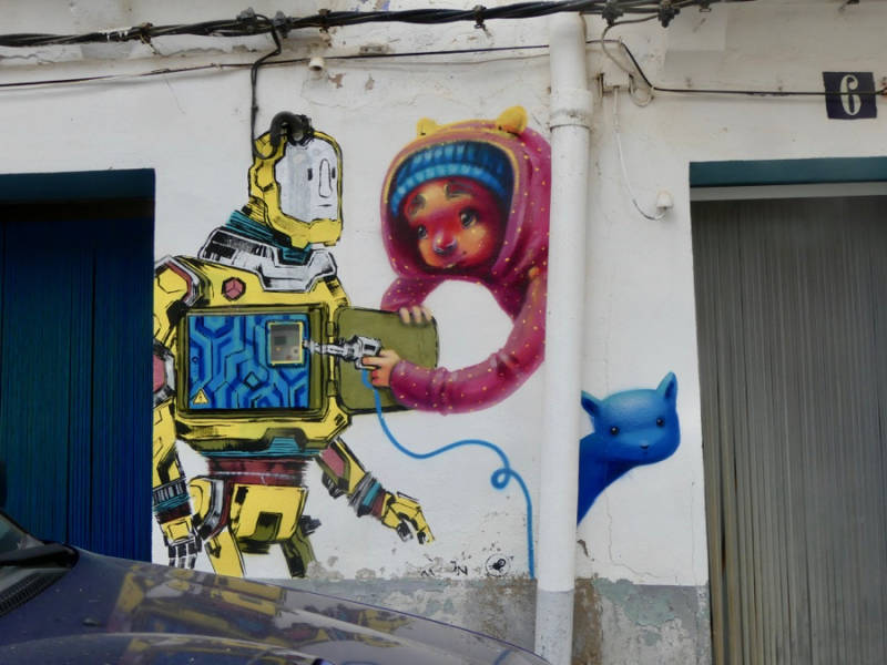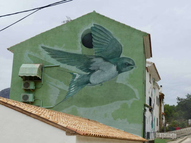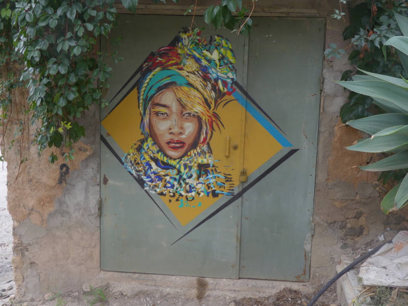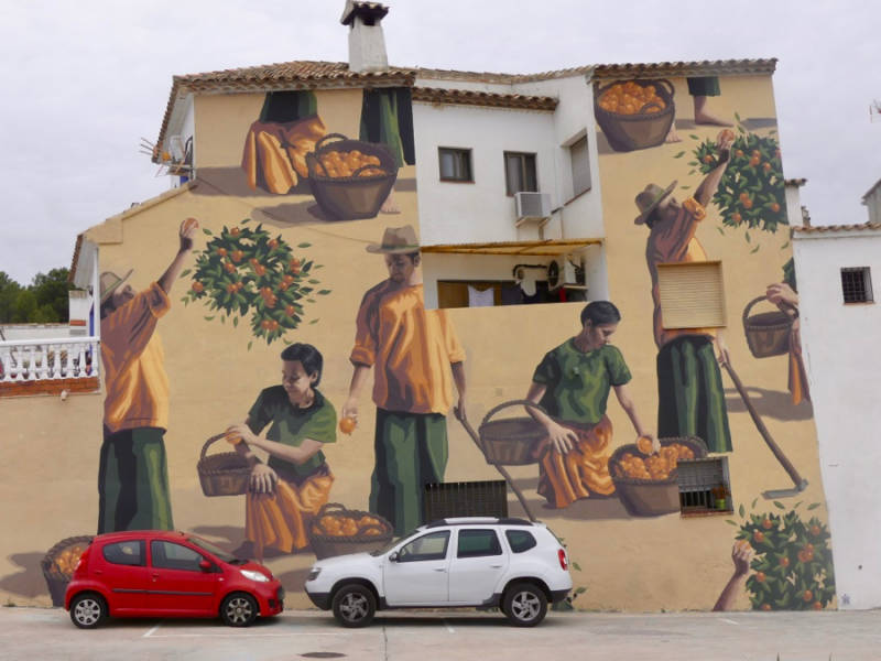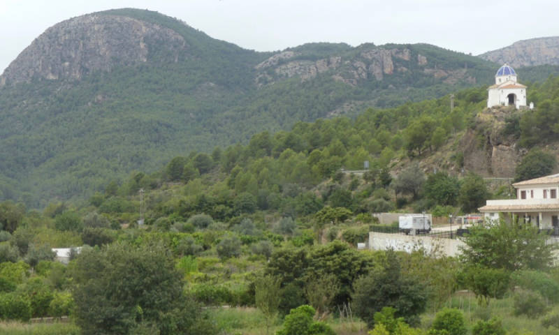 Wellicht dat we een andere keer naar het museum gaan, die ook gesloten was vandaag hoorden we van de buren, we hebben gekozen voor iets heel anders. Het was maar 11km naar het dorpje Fanzara dat bekend is om zijn muurschilderingen in het dorp. Via een mooie route, bochtig doordat de weg door een laaggebergte ging, reden we naar het dorpje. We hebben een beetje moeten manoeuvreren om op een hele kleine parking te komen die aan de rand van het dorpje ligt. De plek hadden we op P4N gevonden, we pasten niet onder een tunneltje door en moesten een steile helling af maar het is gelukt. We hebben op een plekje gestaan met een mooi uitzicht over de bergachtige omgeving en een kerkje op een rots.