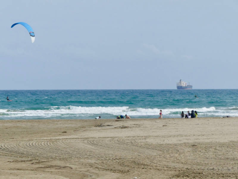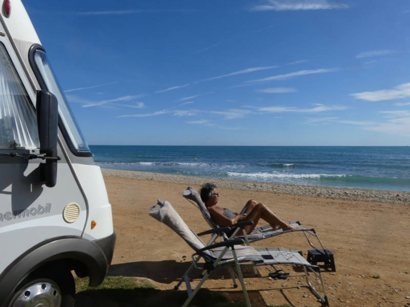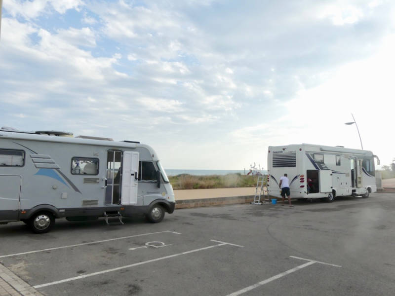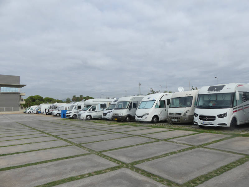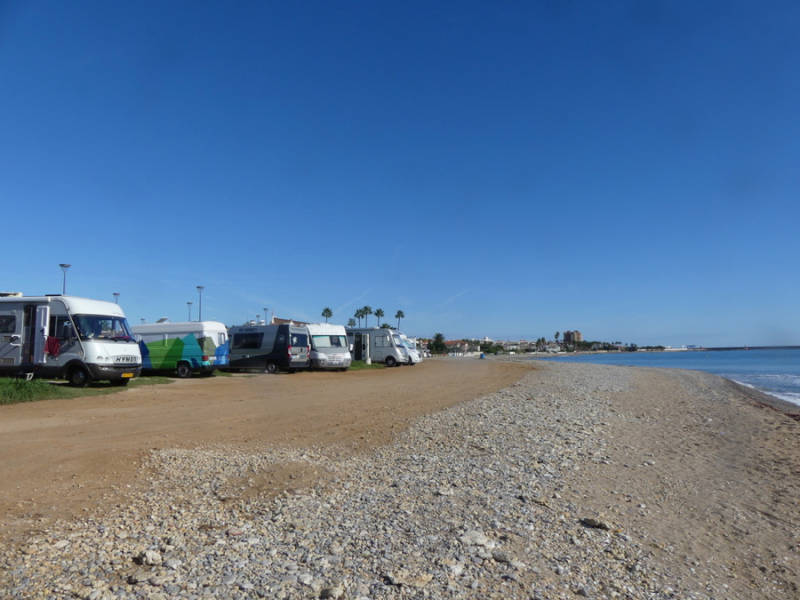 Het was maar 45km rijden naar El Grao de Castellón, de cp waar we nu staan. Stonden we vannacht nog met 4 campers, naast de 2 Nederlandse ook nog 2 Spaanse campers, nu staan we hier met 48 campers, het is helemaal vol. Konden we de afgelopen weken rustig buiten zitten, natuurlijk op de gedoogplek bij Cullera maar ook in Onda de afgelopen dagen, hier mag niets van dit alles. Zelfs de luifel 10cm uit zou niet mogen, er is hier een beheerder die zich uiterst secuur van zijn taak kwijt en onmiddellijk zou toesnellen. Wat hebben we hier te zoeken?. Je hebt hier een mooi strand voor de deur, even de weg over en je kunt je stoeltje zo neerplanten. Je kunt hier fijn wandelen en de Mercadona is op loopafstand. Eigenlijk willen we vrij gaan staan bij het vliegveld morgen, dat is hier 2km vandaan, daar heb je hetzelfde strand maar daar is voor ons de winkel te ver lopen, i.v.m. overgewicht hebben we immers geen fietsen bij ons. Na het boodschappen doen op zaterdag gaan we daar dan wel naar toe.