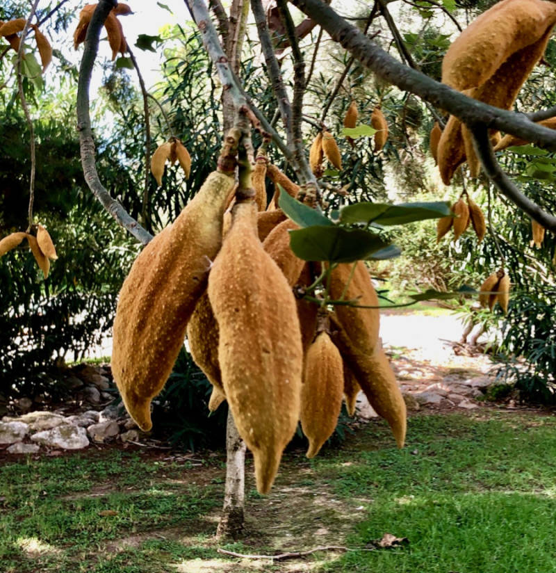 Er staat in het park een boom waaraan kleine bloemen zitten, althans gezeten hebben, ze liggen nu op de grond. Het merkwaardige is dat zo'n klein bloempje vruchten, zaaddozen vormt van bijna 15cm.