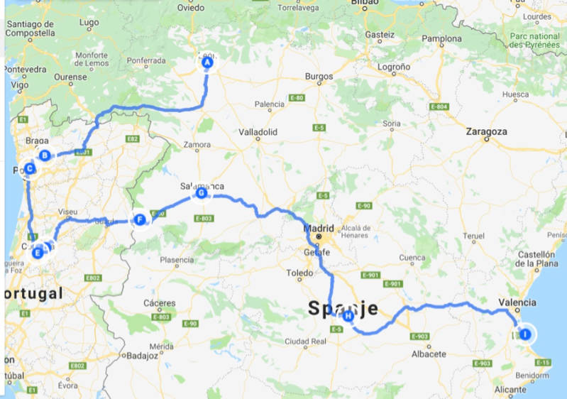 Onze route van León(A) naar Cullera(I) via steden in Portugal en Spanje. Oa Guimaraés(B), Porto(C) Coimbra(E), Salamanca(G)