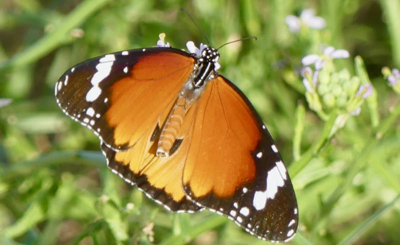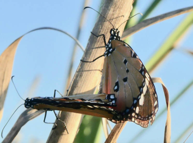 De Monarchvlinders vormen toch wel de kers op de taart van deze heerlijke vrije plaats. Op de rechterfoto vlinderporno, parende Monarchvlinders.