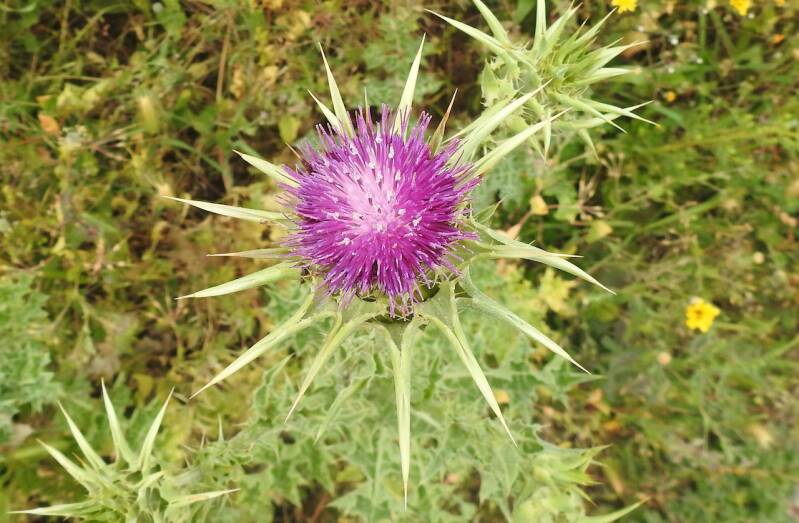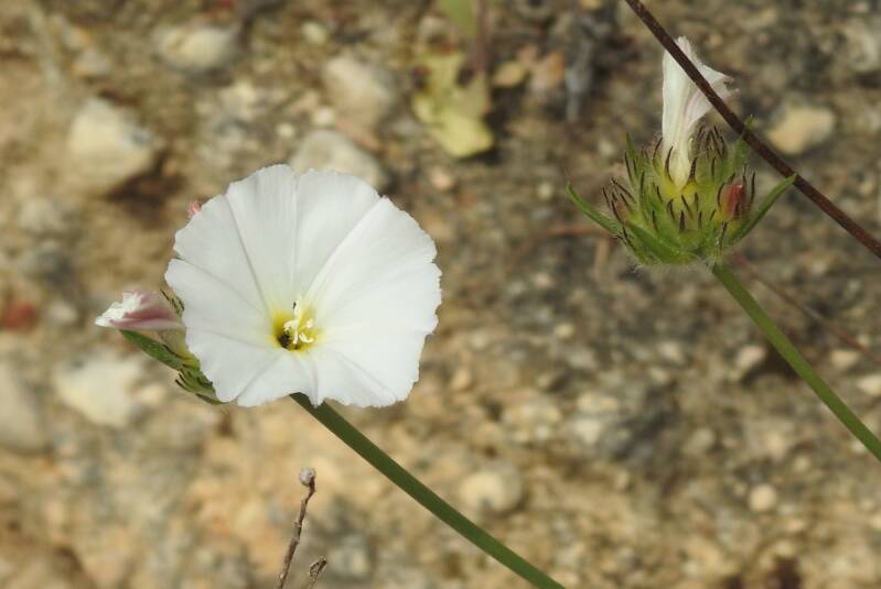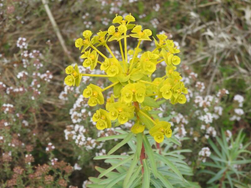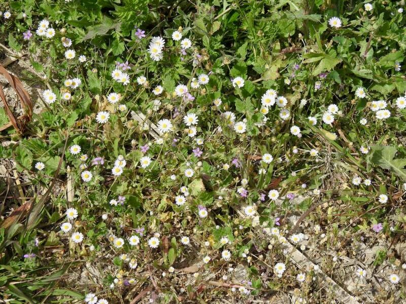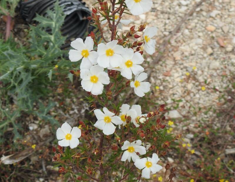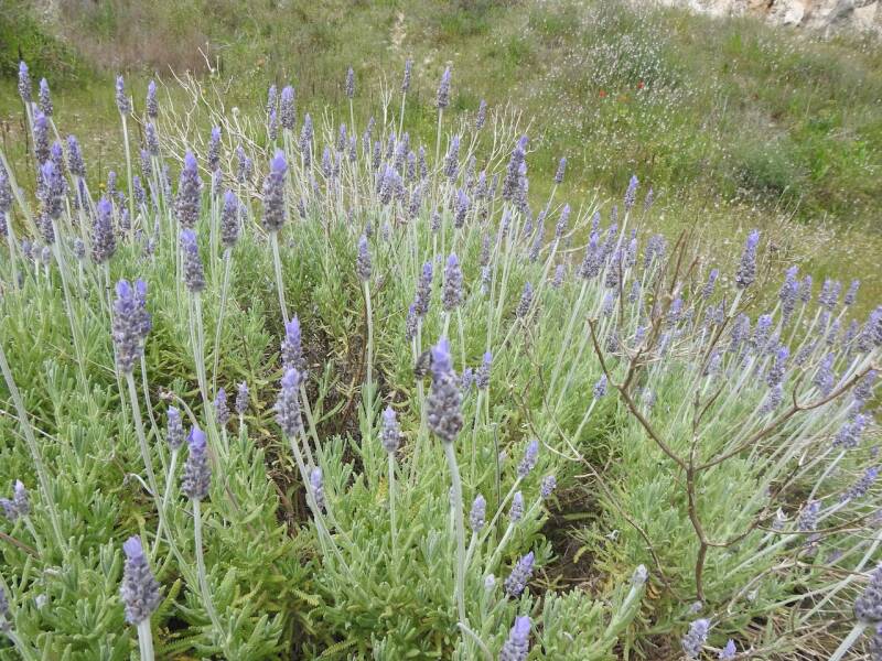 We zijn vanmorgen een eindje de andere kant opgewandeld dan gisteren, nu in de richting van Mazarron. Meteen in het begin kwam je bij een gedeelte waar het pad enorm te lijden had gehad van de stormen van afgelopen winter, er was nu een omleiding. Er stonden veel meer campers langs dit pad dan we tot gezien hebben, zeker 40, we zijn hier dan ook nooit met Pasen geweest. Het is een mooie wandeling langs de Golf van Mazarron, enigszins bizar ook. Links van het pad een zee van plastic, rechts de Middellandse Zee die mooi glad was, het was vrijwel windstil. En langs het pad veel bloeiende bloemen, o.a. Mediterrane Winde, Grote Zandkool en veel Gekroonde Ganzenbloemen.