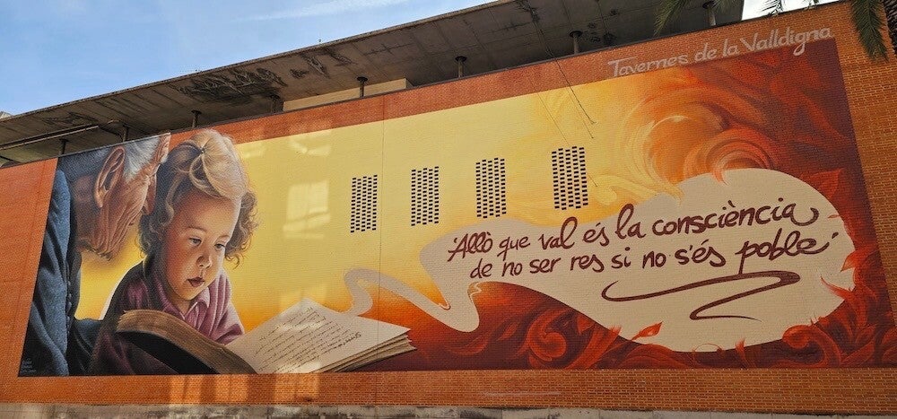 (De foto is van de muurschildering op de bibliotheek van Tavernes de la Valldigna is geplukt van internet, de foto die ik vanuit de auto had genomen, daarop was opa half weggevallen.