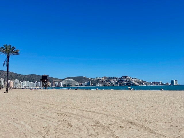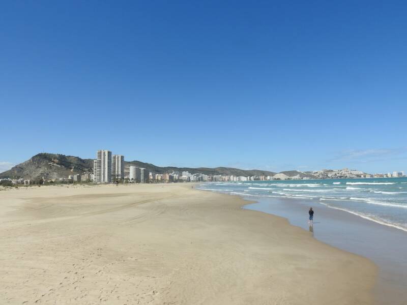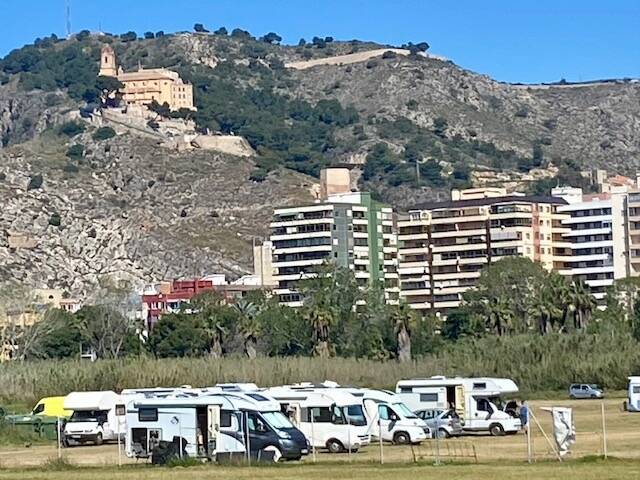 We zijn vanmorgen naar Cullera gereden, slechts een km of 10 noordelijker. Wel met een gevoel, kent u dat, zal het wel zal het niet mogelijk zijn om er te staan, is het niet te druk staat er niet teveel water. Het water was al voor een deel weggetrokken en het was niet te druk, we konden zelfs kiezen. We staan daar nu op een vrij plekje waar we al erg veel komen. Eerst kon je op een heel groot terrein staan, dat diende eerst als parking voor het Medusa festival wat toen in augustus werd gehouden. Nu is er nog een klein stuk over, gescheiden van de zee door een duinenrij. We staan aan de monding van de rivier de Júcar die ontspringt in de Serrrania de Cuenca en stroomt langs Cuenca en Albacete om hier bij Cullera in zee uit te monden.