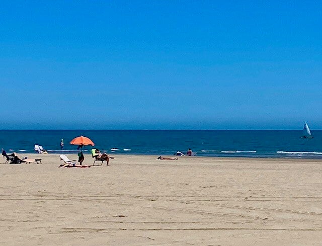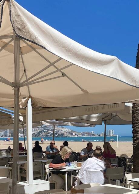 We zijn vanmiddag gaan lunchen op de boulevard, Everdien kon zich herinneren dat we vorig jaar te veel gerechten hadden besteld, dat kregen we toen niet op. Maar goed ook, een portie boquerones en patatas bravas was meer dan voldoende. Ik maakte een foto vanaf het terras van een zeilbootje op zee en we zagen toen in de verte zeebewolking aan komen. Dat was om 14.45 en toen we een kwartier later de lunch op hadden kwam de zeebewolking voor de zon en was het fris door de zeewind en was het strand al snel bijna leeg. Echter toen we een uur later bij de camper waren was het weer helemaal opgeklaard en hebben we weer heerlijk in de zon gezeten. Een heel klein smetje op deze verder prachtige dag met een graad of 24.