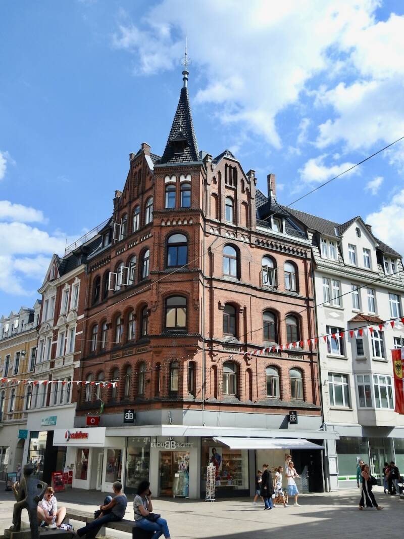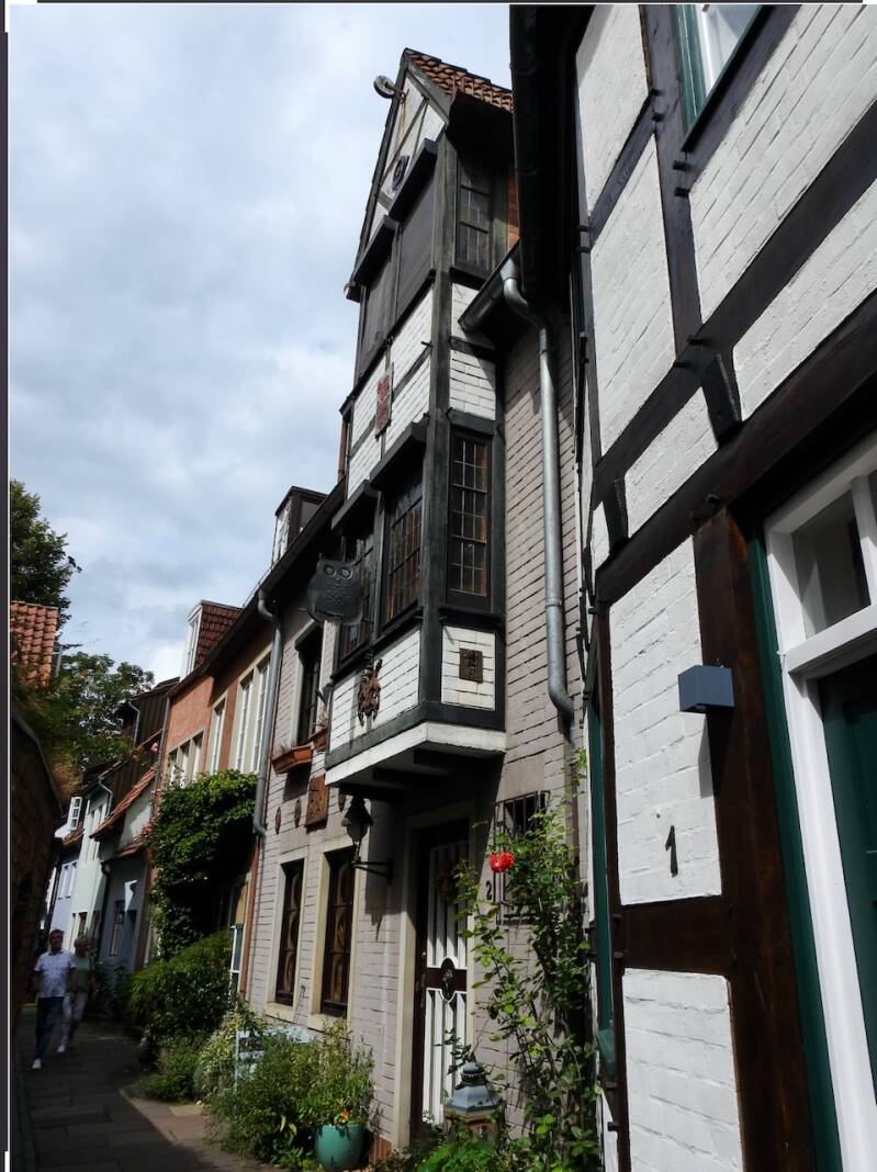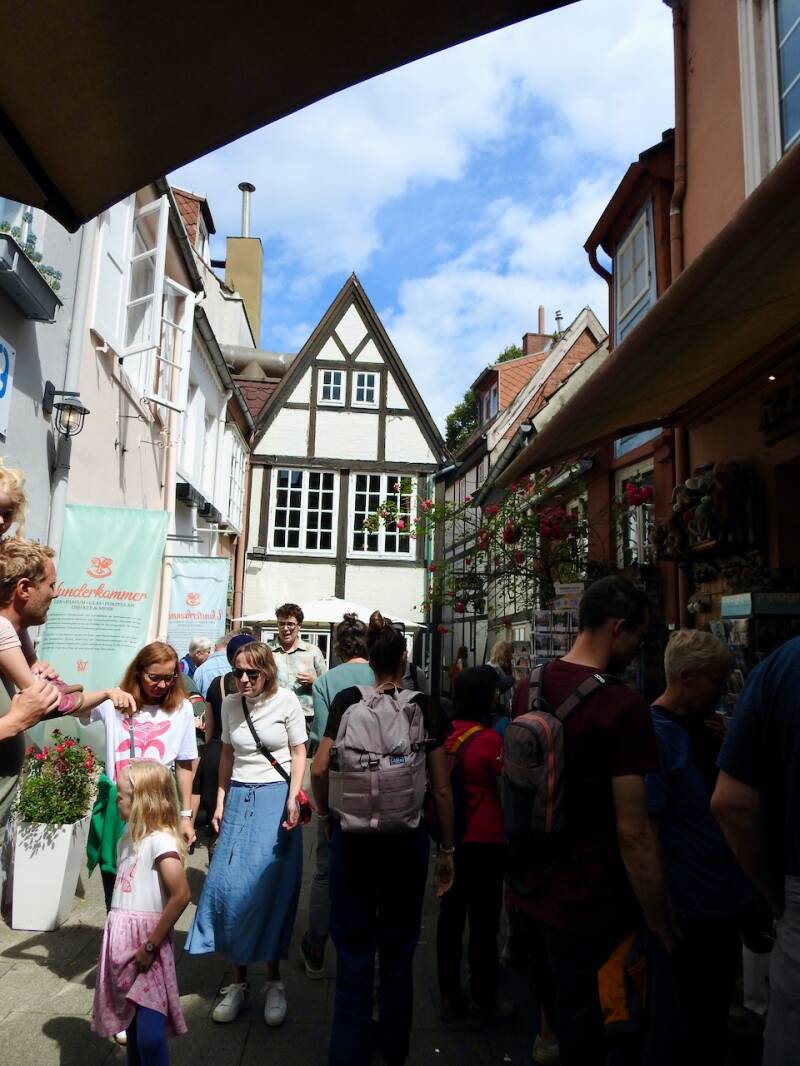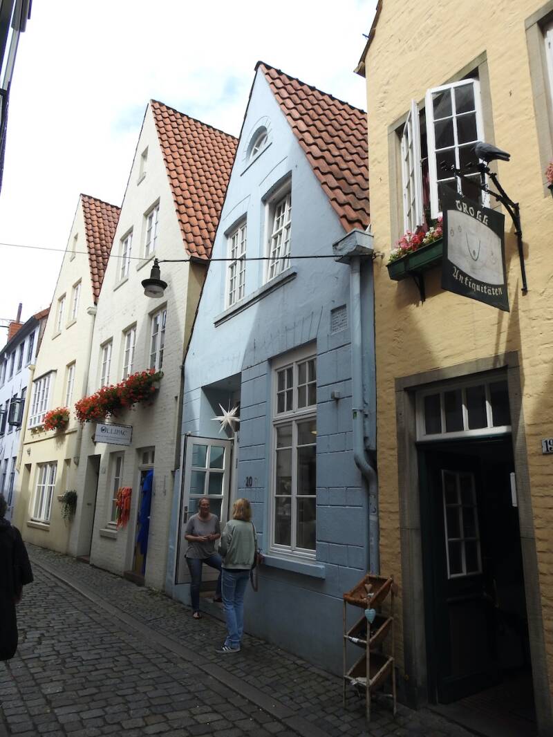 Een bezienswaardigheid is het kleine straatje de Böttcherstrasse, ooit een gewoon straatje, totdat het in 1926-1930 werd omgevormd tot een straatje in Art Deco stijl gebouwd met bruinrood baksteen. Het werd gefinancierd door een rijke koopman. De Nazis hebben het straatje in stand gehouden om als voorbeeld van Entartete Kunst te gelden. Dat er drommen toeristen zijn in dit seizoen was in dit nauwe straatje goed te merken, groepjes met gids al dan niet voorzien van een ‘schipperspet.’ Want hoewel 50km van zee heeft Bremen veel met scheepvaart van doen gehad, aan de monding van de Weser ligt Bremerhafen, samen met Bremen een vrijstaat.