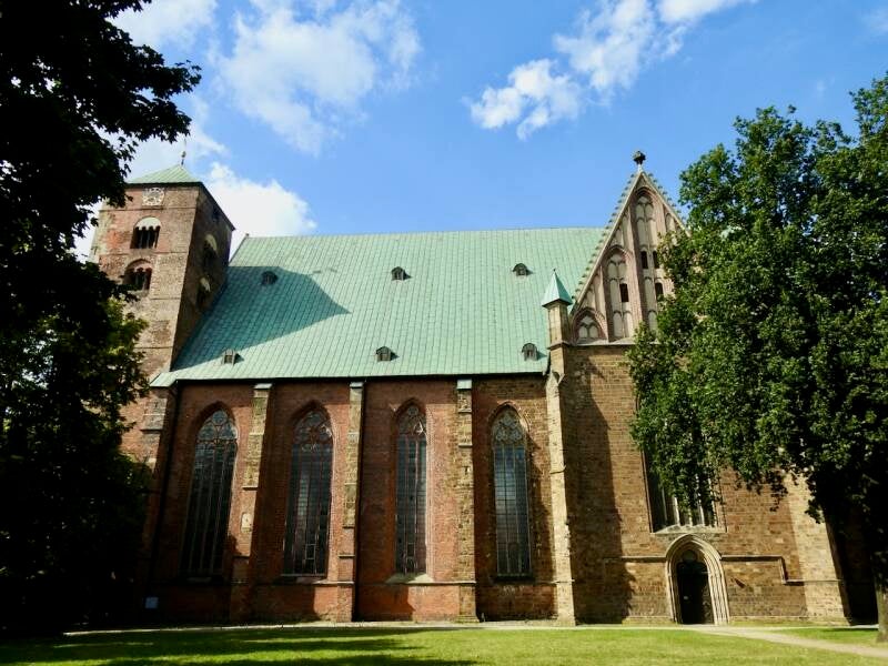 Nadat we een tijdje bij de camper hadden zitten lezen, dwz Everdien een boek en ik me weer bezig had gehouden met Spaanse les via Duolingo, zijn we de stad ingewandeld. Na de drukte van het weekend in Bremen was dit stadje weer heel anders, niet veel toeristen. We hebben rondgewandeld maar er waren wat bezienswaardigheden w.o. 2 kerken gesloten omdat het maandag was. Wel open was de Dom, daar zijn we dan wel in geweest. Ook hier een eenvoudig interieur, wel een mooie kleurstelling.