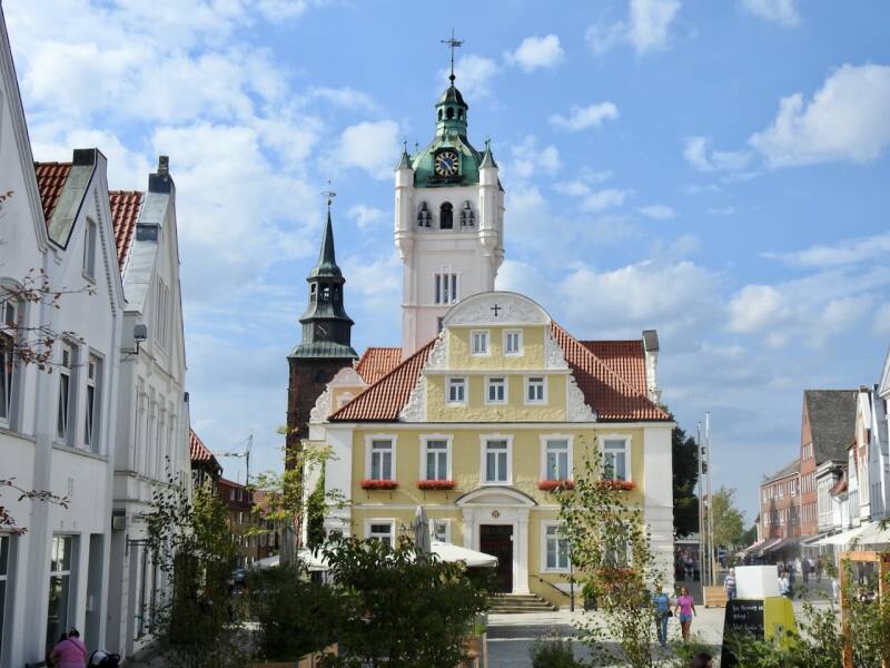 Het mooie Rathaus van Verden met klokkentoren. Daar linksachter de toren van de Johanneskirche.