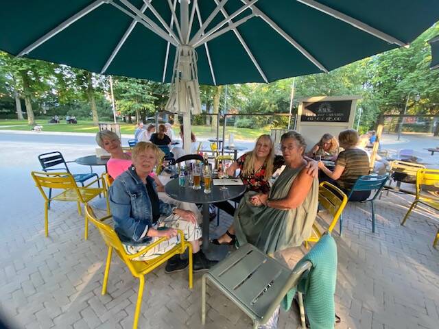 Stonden we vannacht met een zestal campers, waaronder 2 Duitse en een Zweedse camper, hier staan er wel 50. Hier, dat is de cp in Kardinge, we staan daar altijd als we in Groningen zijn. Je staat vlakbij de bushalte en je bent zo in de stad. Die hebben we niet bezocht, we zijn hier voor de verjaardag van mijn zuster waar we halverwege de middag kwamen. Eerst thuis bijgepraat en daarna naar het Noorderplantsoen waar we traditiegetrouw naar het restaurant zijn gegaan en ons hebben neergevlijd op het terras. Daar kwamen ook nog 2 vriendinnen van zus Edith, een kenden we al ende andere bleek ook al een leuke vriendin te zijn waar het ook onmiddellijk mee klikte. Zodoende was het erg gezellig en we hebben lekker gegeten en gedronken en gebabbeld.