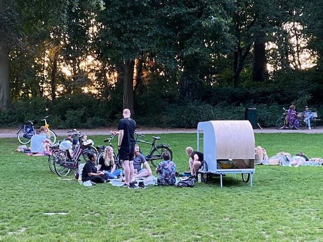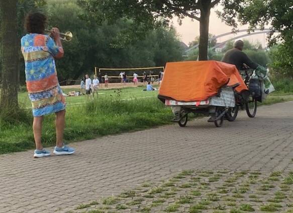 Het was een heerlijke avond gisteren , voor onze neus werd er op de weide nog lang geluierd, gevolleybald , badminton gespeeld en gewandeld. Onder de brug woont een schizofreen in een soort tent die hij op het aanhangwagentje van zijn fiets heeft zitten. Het aanhangwagentje is volgeschreven met teksten, gisterenavond had hij zijn hele handel op het karretje achter zijn fiets en stond hij om de 10 meter stil en daarbij een of andere boodschap erg luid en langdurig te verkondigen. Onze camperbuurvrouw was het kennelijk zat en pakte haar trompet en in de schemering trok er een Jeroen Bosch achtig tafereel aan ons voorbij: de man lopend met zijn fiets en daarachter onze buurvrouw met trompet die hem ‘verjoeg’ met eentonige getoeter. En het bleef nog lang gezellig en zwoel buiten.
