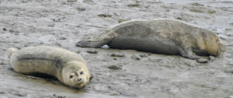 Na de lunch zijn we op de fiets gesprongen en naar de uitkijkpunten gefietst. Over een fietspad wat onderlangs de dijk liep en waar over een klein stuk ook auto’s mochten rijden, veel Duitse auto’s, Duitsland is dichtbij. Een aardig fietstochtje en het was niet al te ver fietsen, 5 km, toen we bij het zeehonden spotplekje waren gekomen. We hoorden dat ’s avonds de beste tijd is om zeehonden te spotten, wij zagen er in ieder geval 2 liggen. Het leek ons een moeder met een jong, geen huiler dus, hoewel het jong best wel zielig keek.