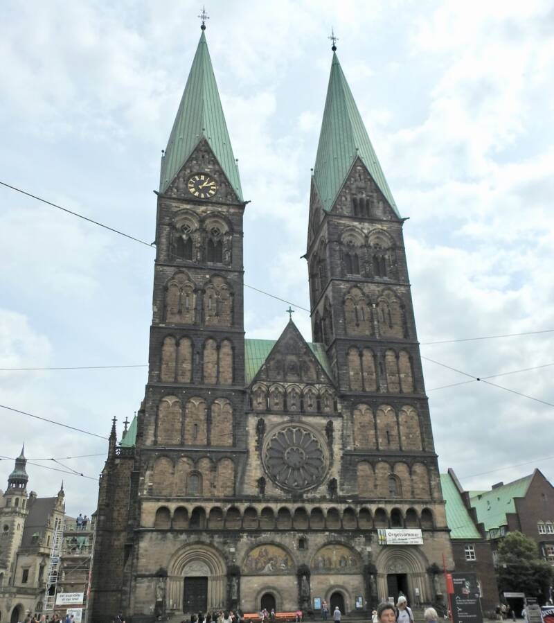 Rondom het middaguur zijn we weer naar het oude centrum van Bremen gewandeld, wat dikker gekleed want het was een stuk frisser dan gisteren. Eerst nog even rondom de Marktplatz gewandeld, nog beter het Rathaus bekeken en vervolgens hebben we de st Petri Dom bezichtigd die ongeveer 1200 jaar oud is. Omdat het geen katholieke kerk is ontbreekt binnen de overdadige pracht en praal maar heeft de romaanse kathedraal een eenvoudig interieur. Er zijn een paar mooie gebrandschilderde ramen in de toch wel grote kerk en ook de barokke kansel is mooi.