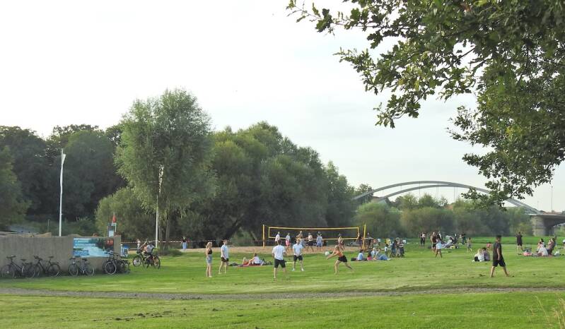We hebben vrijwel de hele weg parallel aan de Weser gereden, zonder maar iets van de rivier te zien. De cp in Minden is ruim 50m van de Weser maar die wordt voor een deel door bosjes en riet aan ons oog onttrokken. En niet te vergeten door de Beach Bar vlak voor onze neus, met strandje erbij. Vóór ons ook veel mensen op de zonneweide, voor een deel afkomstig uit het middenoosten zo te zien en vooral die mensen zijn gewend om te picknicken.