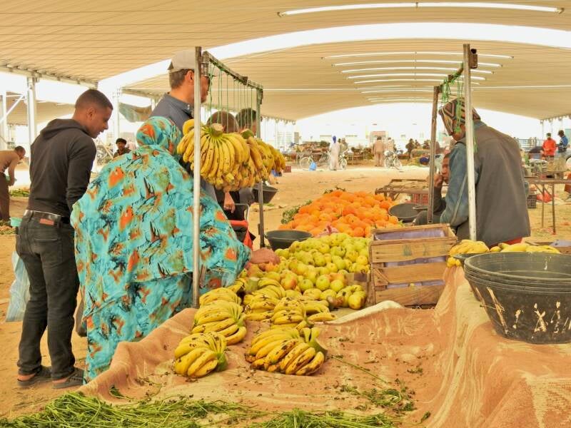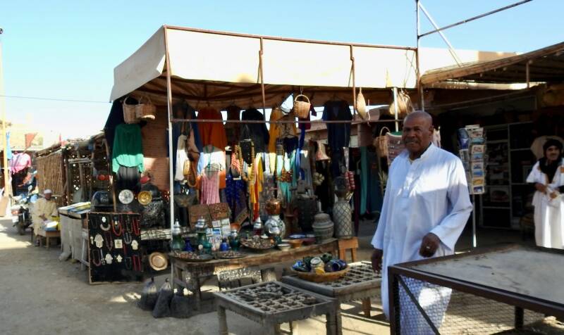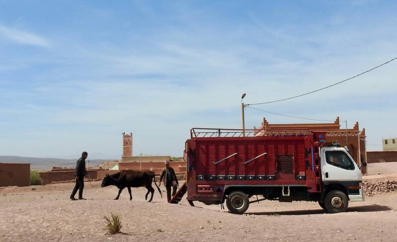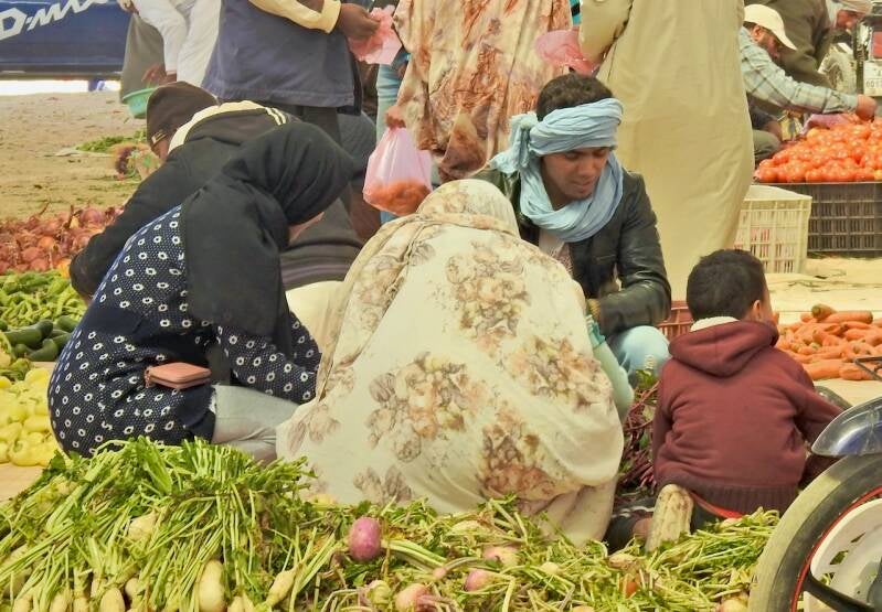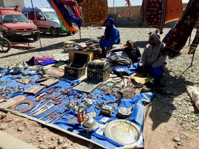 We hebben vannacht wat wat minder goed geslapen , het zat ons toch niet lekker dat de handrem het wel goed deed op een flauwe helling bij de garage, echter niet op de steilere helling hier op de camping. Dus besloten we vanmorgen om weer terug te gaan naar de garage, die is ivm de ramadan ws om 10.00 uur open zei Mohammed de campingbaas. Wij waren daar om 10.20 uur, de garage was nog gesloten. Iemand die daar rond hing belde en zei dat de garagehouder eraan zou komen. Dat was dus 1,5 uur wachten, we waren niet uitgeslapen en waren er veel te vroeg, Europese tijd. En de garage ging om 11.00 uur plaatselijke tijd open, vandaar. Veel mensen gaan weer slapen nadat ze de maaltijd voor zonsondergang hebben genuttigd . ( Suhoor is de maaltijd die voor zonsopgang wordt genuttigd om de dag te beginnen.) Maar toen de monteur er eenmaal was was het klusje snel klaar, hij heeft de handrem kabel bijgesteld. Nu doet hij het in ieder geval een stuk beter en met opnieuw de verzekering ‘als je er een tijdje mee gereden hebt doet hij het helemaal goed’ zijn we weer vertrokken, we kunnen niet anders dan dat geloven. E zijn daarna naar de souk op woensdag gegaan, dat was altijd een’vrouwensouk’ omdat er een 10-tal kraampjes stonden waar vrouwen uit het Drâadal hun huisnijverheid verkochten. Dat is echter verleden tijd, nu slechts weinig andere kramen als je het vergelijkt met de grote souk op zondag. Maar we hadden wat groente en fruit nodig , die was natuurlijk wel te krijgen op deze minder sfeervolle souk.