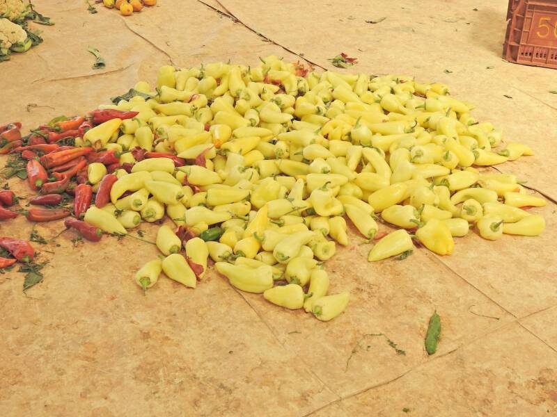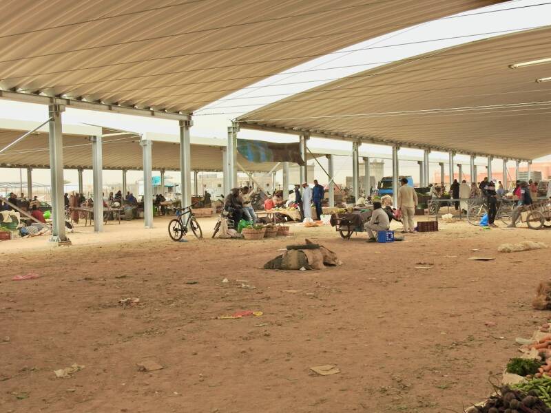 We zijn met de fiets naar de wekelijkse souk gegaan, het waaide vanmorgen hard, ongeveer 60 km p.u.. daar om stoof het behoorlijk met fijn zand en stof. Klepperende zeilen bij de kraampjes en veel handelaren waren vanwege de wind niet komen opdagen. Ook hier was de groenteafdeling nu in een open overdekte hal gevestigd wat minder sfeervol is dan we hier gewend zijn van voor die tijd, maar mensen hebben zo geen last van de zon. Het was toch wel weer een kleurrijk gebeuren, iets meer mannen dan vrouwen op deze souk. Jammer van de wind, we zijn daardoor niet zo lang gebleven