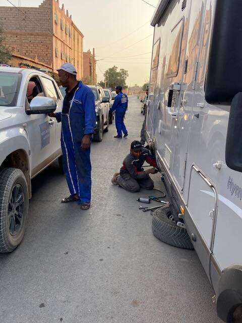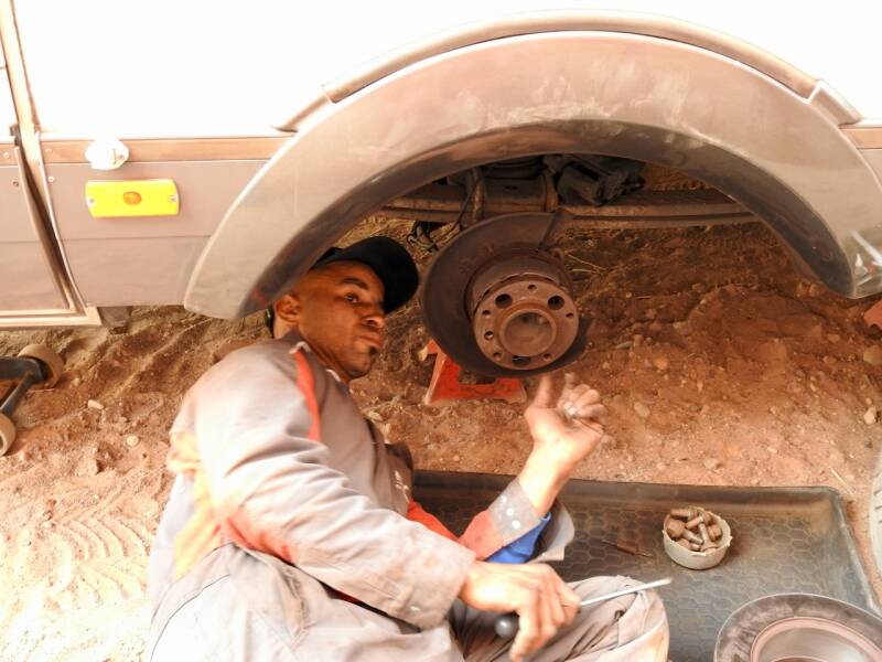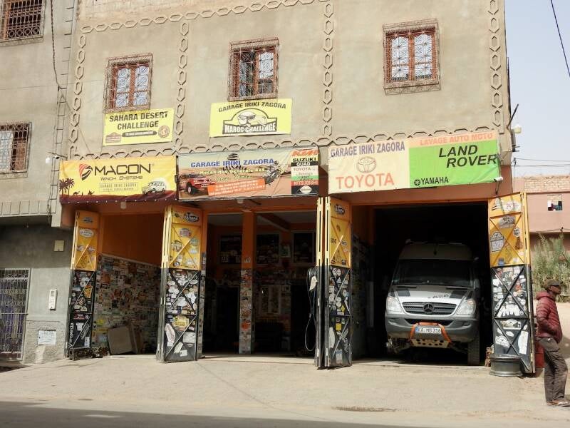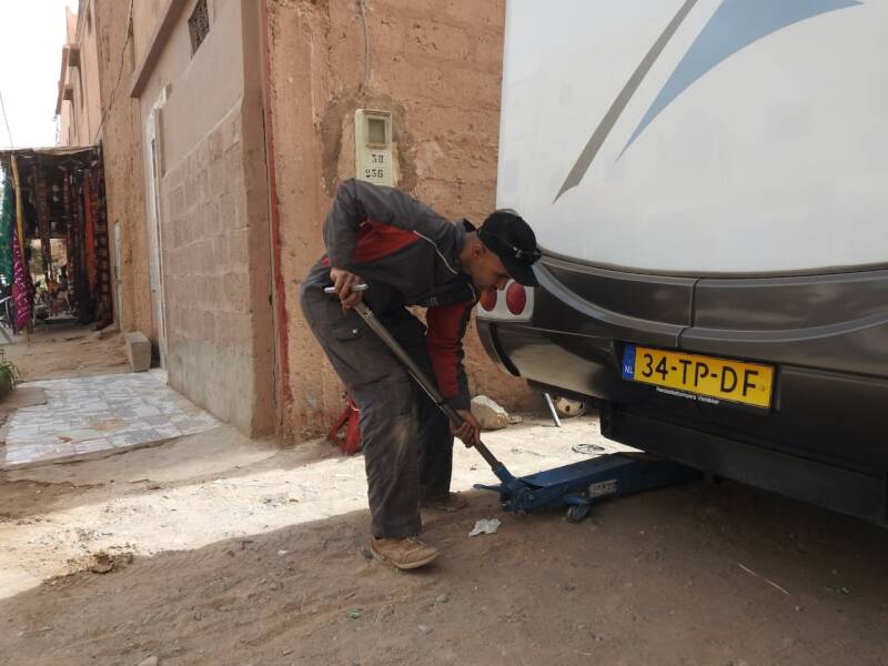 Hoe het verder met de opening van restaurants in Zagora zit weten we het niet , we zijn vanaf 11.00 tot 19.00uur bij de garage Iriki geweest. Vanmorgen bedacht ik dat we van onze rustpauze ivm met mijn voet gebruik moesten maken om onze handrem te laten repareren. Ondanks de toezegging dat de handrem beter zou gaan functioneren als hij langer gebruikt was, was dat niet het geval. En in Zagora zijn garages die veel ervaring hebben met reparaties uit de tijd van de Parijs-Dakar rally’s en nog steeds komen hier bij de garages 4 x 4 trucks voor reparaties. Het kwam vooral neer op wachten, eerst op een specialist handremmen of zoiets , die kwam kijken nadat de wielen eraf waren en zei dat het gemaakt kon worden. Ook de remschijven moesten worden geschuurd en na deze mededeling om 14.30 uur kon het wachten beginnen, voordat alles weer gemonteerd zou kunnen worden waren we 4 uur verder voorspelde de chef. Gelukkig hadden we wel stoelen bij ons zodat we op de stoep konden lezen.