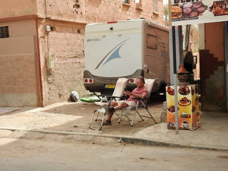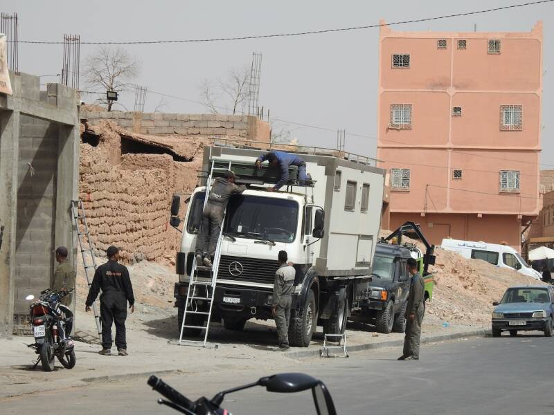 We hebben tijdens het wachten tot de reparatie klaar was naast het lezen wat we deden niet alleen nog een ring voor mij gekocht maar ook regelmatig om ons heen gekeken . zo zagen wij bijvoorbeeld tegen vier uur , twee slapende winkeliers die op de stoep lagen . Verder een om zijn as rondjes draaiende schizofreen midden op de weg en een andere leipdoos die een oude verkreukelde krant las, die keurig opvouwde en onder zijn voet legde. En de nodige op de stoeprand zittende en hangende mannen en groepjes huisvrouwen die allengs verdwenen waarschijnlijk om het avondmaal te bereiden. Laat op de middag zag je weer mensen met boodschappentassen en stokbroden lopen, het zou niet al te lang meer duren of er mocht weer gegeten worden, na de bereiding uiteraard.. In eerste instantie was de reparatie van de handrem klaar om 18.15 uur maar we waren niet tevreden na een proefritje. Daarom opnieuw de wielen er onderuit en werd de handrem bijgesteld. Daarna was het in orde en om 19.00 uur waren we op de camping, wat kun je moe worden van niets dan dan wachten. De reparatie kostte trouwens 1700 Dh, arbeidsloon en nieuwe remvoering. Of dit nieuwe of weer zelfgemaakte zijn, dat weten we niet, dat proces speelde zich elders af.