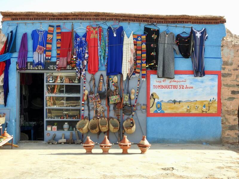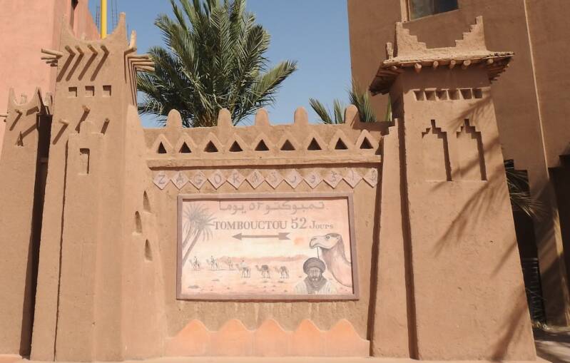 We staan nu in Agdz, een route van 95 km vanaf Zagora ,één van de dorpen langs de voormalige Karavaan route tussen Marokko en Afrika ten zuiden van de Sahara. die via Marrakesh de steden aan de Atlantische Oceaan met met Timboektoe verbindt en heeft lange tijd een belangrijke economische rol gespeeld. Het stadje met zo'n 10.000 inwoners is eigenlijk één langgerekte bebouwde weg die met enkele zijstraten het centrum van het plaatsje vormt. Timboektoe is vermoedelijk in de 12e eeuw gesticht door Toearegs als pleisterplaats voor de karavaanhandel in zout. Dit werd verruild in West-Afrika voor onder meer goud en slaven. Langs de karavaan route , werd op verschillende plaatsen tol geheven. O.a op de plek waar we gisteren de foto maakten in Zagora , ‘Tombouctou 52 jours’.