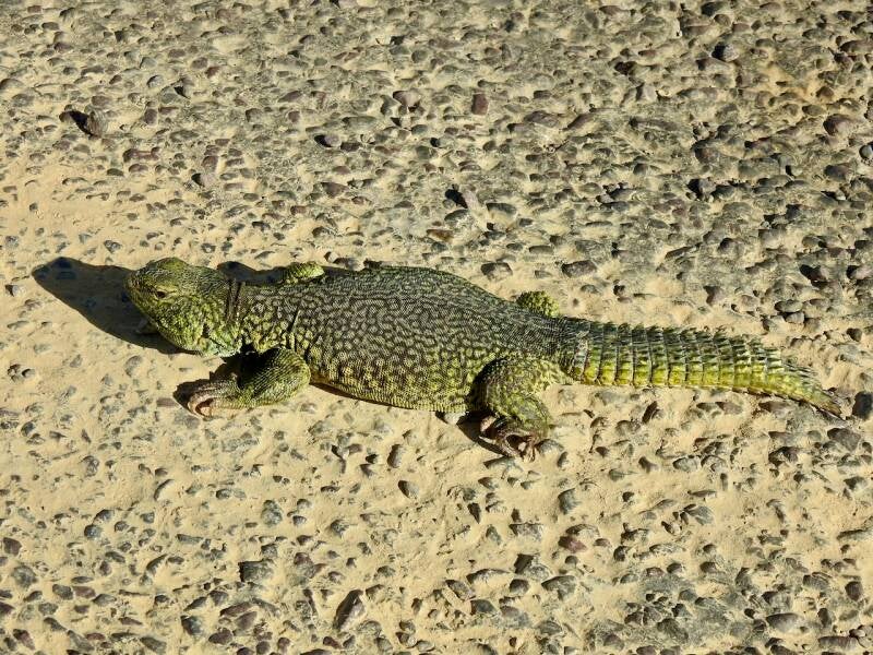 Al snel klommen we via de N9 over de weg omhoog, waar werkzaamheden waren om de weg te verbreden en bochten eruit te halen,, ondertussen genietend van de prachtige uitzichten op de bergen. Op een gegeven moment, nog voor we de top van de pas Tizi-n -Tinififft hadden bereikt, kwamen we op het punt dat de weg helemaal vernieuwd was. Daar op een uituitzichtpunt, waren 2 jongens vogels broodkruimels en water aan het geven. We zagen o.a. woestijnleeuweriken en een zwarte tapuit. Ze hadden ook een leguaan bij zich, Everdien schrok er voor terug om hem op de schouder te laten zitten. Gelukkig was het niet druk op de weg, we reden ons eigen tempo, af en toe iets langzamer om Everdien foto’s te laten maken. We daalden af en zagen een dorp in een oase liggen. Toen we die gepasseerd waren zagen we dat er meer groen in het landschap verscheen. Vlak voor Ouarzazate was er zelfs wat water in een riviertje, smeltwater uit de Hoge Atlas.