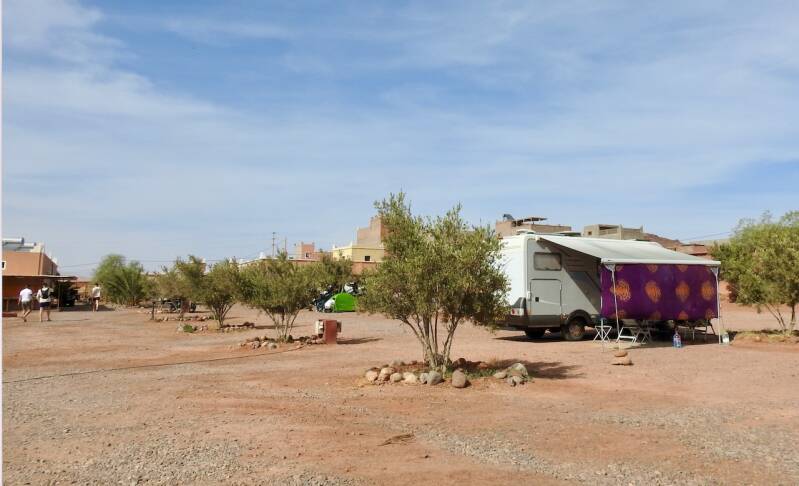 In Ouarzazate zijn we eerst langs de Carrefour gegaan waar we ruim hebben ingeslagen, we hebben o.a.weer voldoende blauwaderkaas, gerookte kalkoenfilet, camembert en sardine- paté. Het was nog maar 12 km , o.a. langs de filmstudio’s in Ouarzazate, naar camping L’Escale de Ouarzazate waar we nu staan. We hebben er al een paar x eerder gestaan, het bevalt ons hier prima door de prachtige omgeving waar je naar verschillende kanten kunt wandelen naar kleine dorpen. We zijn gewend dat hier altijd veel campers staan, nu staan we met 8 campers waaronder 3 Nederlandse. In een daarvan een leuk jong stel met 2 kinderen die een jaar gaan reizen, in januari zijn ze begonnen . Vanmiddag een kleine wandeling gemaakt door het dorp Ait Zenib wat naast de camping ligt. Verder lekker gelezen in de schaduw en aan het eind van de middag hier op de camping een biertje gehaald en lekker bij de camper opgedronken. De eigenaar van de camping is een Fransman die met een Marokkaanse getrouwd is, vandaar bier tijdens de ramadan. Omdat het vandaag 30º was, ging het biertje er soepel in.