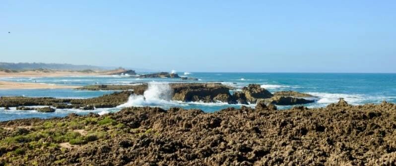 Van de bovenstad an Oualidia naar beneden rijdend kijk je én over de Oceaan én over een stukje lagune