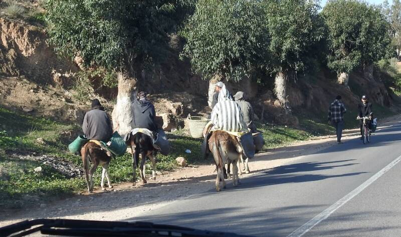Het eerst 1ste deel van de 170km was vlak, daarna moesten we over een heuvelrug met vrij stijle hellingen waarbij we af en toe achter een vrachtwagen zaten en maar 20km konden rijden. En er werd veel gezwaaid door kinderen of wegwerkers, er was trouwens weinig autoverkeer vonden we. Het kan verbeelding zijn maar wordt er minder auto gereden omdat ook hier inflatie heerst?( inflatie maar eens nader induiken), De brandstofprijzen zullen hoog zijn voor de gemiddelde autorijder in Marokko. Wel zijn er langs de weg karren met kleine Marokkaanse paardjes ervoor om mensen en/of vracht te vervoeren of zit men in amazonezit op ezeltjes, niet alleen als er een souk is..