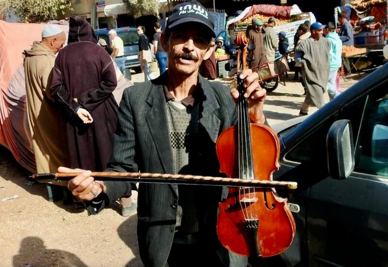 Weer verder over de souk geslenterd, je geeft je ogen en andere zintuigen de kost, kijkt naar allerhande producten die verkocht worden en ook naar de mensen natuurlijk die hier veelal gekleed gaan in een donkere boernoes , al dan niet gestreept, met puntmuts, een hoodie avant la lettre. We hebben alleen gezouten pinda’s met vlies, erg lekker, en bananen en mandarijnen gekocht. Na bijna 2 uur slenteren en schuifelen daar waar het druk was, vonden we het tijd worden voor een kop koffie . En wie zaten daar op het terras, juist ja, het leuke viertal die we eerder bij de koeien hadden getroffen. Dus zijn we bij hen aangeschoven , voor een nosnos, koffie met opgeklopte melk die heerlijk smaakte. Even een praatje maakt met een aardige jongeman uit Rabat, hij had veel gereisd en praatte niet alleen perfectEngels maar ook wat Nederlands. Hij was hier bezig met een project voor arme mensen op te zetten die nu in de afrondende fase was. Over arme mensen gesproken, we geven elke dag 1Dh aan een arme sloeber, een broodje kost ook nog steeds 1 Dh. Vandaag hebben we wat meer mensen een Dirham gegeven, we hadden nog wat dagen zonder een gift in te halen zullen we maar zeggen.