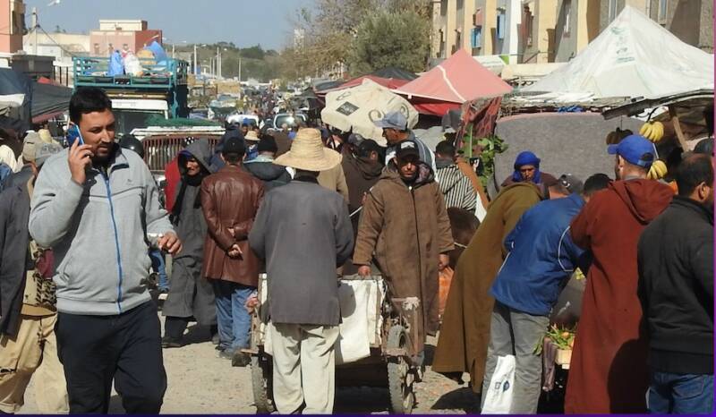 We zijn vanmorgen met z’n zessen met de grand taxi naar de souk in Had Drâ gereden à 5 Dh p.p. Dat is dezelfde prijs die we een aantal jaren geleden ook betaalden, de verhoogde dieselprijs wordt kennelijk niet doorberekend. Bij de souk ging ieder zijn eigen gang en wij zijn eerst naar de ‘beesten’afdeling gelopen. De souk is nl onderverdeeld in diverse afdelingen en wij kwamen te laat om nog dromedarissen te zien, die waren al vroeg verhandeld. Wel koeien, ezels, schapen en geiten die van eigenaar verwisselden dmv handjeklap, wat je overal op de wereld wel ziet als het om dierenhandel gaat. Koeien worden in vrachtwagens geladen, soms 2 verdiepingen hoog, soms ook een in de laadbak van een pick up , eigenlijk zijn het meest jonge stieren die voor het vlees verkocht worden. 2 stiertjes braken los, ze zaten nog wel met een touw aan elkaar en al bokkensprongen makend renden ze door de boeren die uiteen stoven. Onze schoenen zaten al snel onder de koeienstront en de mannen, de boeren zagen er ook niet al te frisgewassen uit, hun kleiding dan. Het is vooral een mannenzaak zo’n souk , slechts sporadisch zie je een vrouw lopen. Mannen die elkaar soms een maal per week zien op juist deze souk, sommigen lopen dan ook hand in hand. Naast een ontmoetingsfunctie heeft de souk natuurlijk in de eerste plaats een koop/verkoopfunctie, je kunt er van alles kopen. Er is een hout-, groente- , stoffen, 2e handskleding, ijzer- en vleesafdeling. Die laatste hebben we vermeden omdat vlees wat van de koe wordt gesneden en gekocht ter plekke op de houtskoolgrill gaat wat een enorme stank en rookontwikkeling veroorzaakt, niet goed voor de longen lijkt ons.