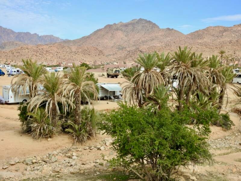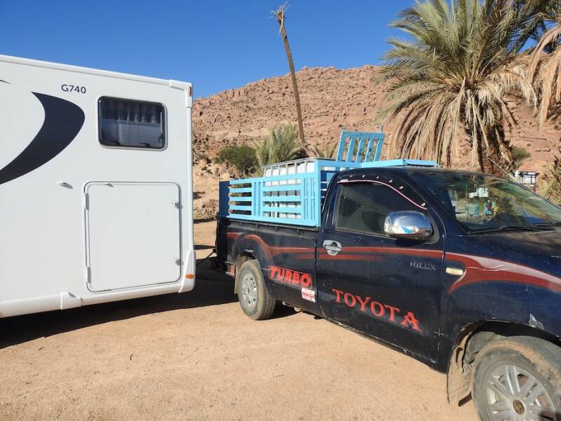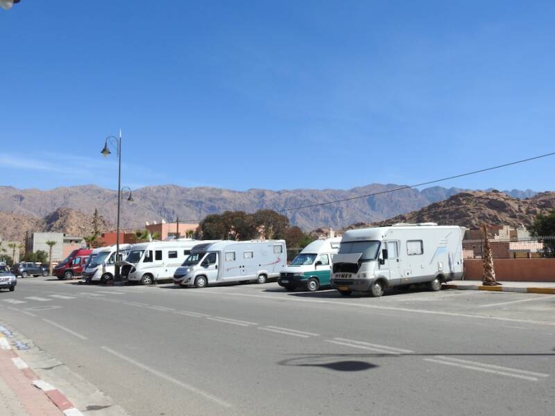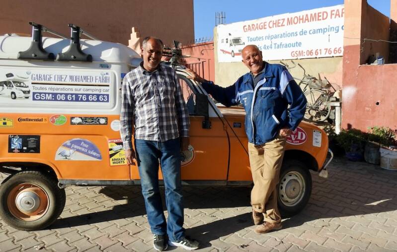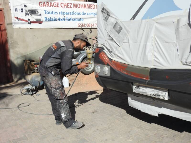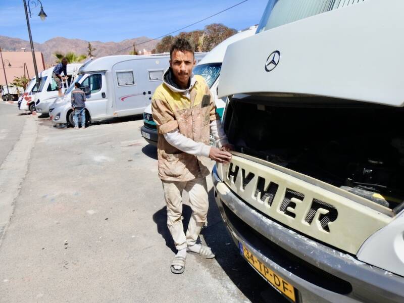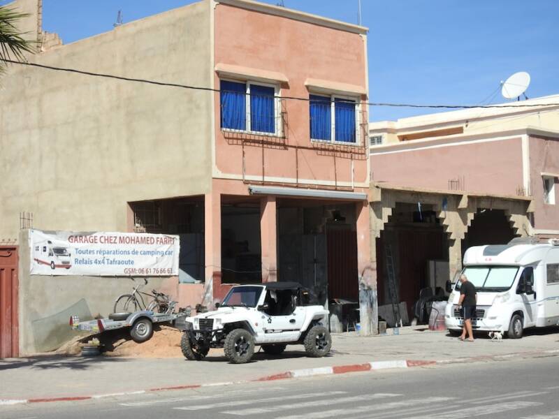 Vanmorgen moesten om 10.00 uur bij garage Mohammed Farih zijn om wat spuitwerk te laten doen. Aanvankelijk wilden we daar niet alleen onze watervoorraad aanvullen, maar ook 2 cassettes legen. Achteraf leek het ons niet zo’n goed idee om met 2 cassettes aan te komen en zijn we bij het enige camperservice-station in Marokko deze gaan legen waar het aardig druk was.