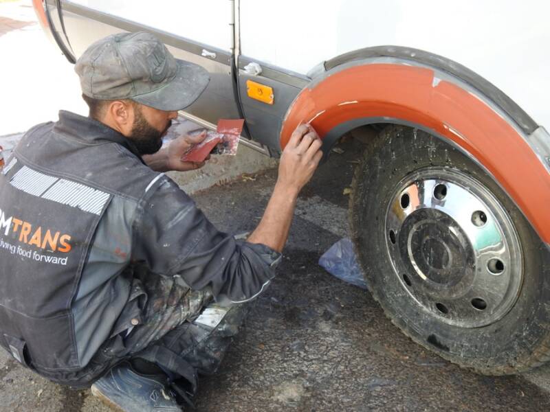 Tegen 10.00 uur vanmorgen begon men met het afplakken van de camper met kranten om daarna te kunnen spuiten. Het rode spul van gisteren wat ze mastiek noemen is ws een soort primer want er werd nu overheen gespoten met lak. Vervolgens werd er nog met een transparante lak overheen gespoten, een uurtje drogen en klaar was de camper. Er is een spatbord meer gespoten dan we afgesproken hadden, toch bleef de prijs hetzelfde, nog geen €100,-. De jongen die vandaag en ook gisteren voor een deel gewerkt heeft aan onze camper hebben we een fooi gegeven. We zijn tevreden over het resultaat.