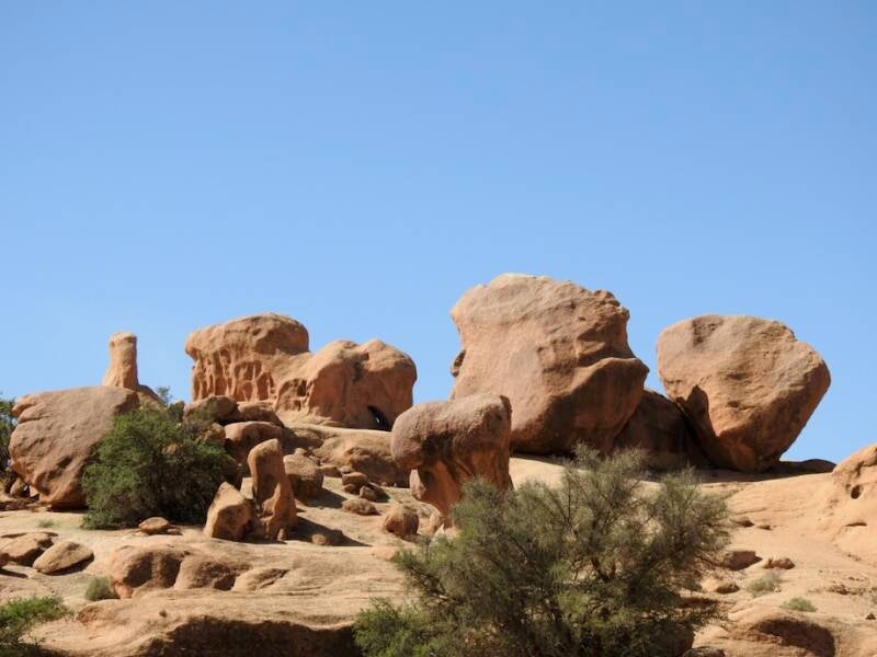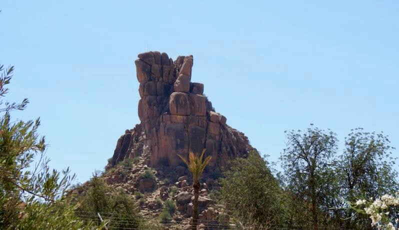 We kwamen uit in het dorp Aguerd Oudard die bekend is om zijn hoge rots die meestal ,door zijn vorm, De Hoed van Napoleon wordt genoemd, ook wel ‘de Vinger.’ In het dorp kwamen we weer op de asfaltweg die afdaalde naar Tafraout waar we naar hotel/restaurant Tifawin gingen om daar te lunchen, heerlijke salades met frites, Henk at kip en we waren nog geen €4,- p.p. kwijt inclusief fooi. We waren het er over eens dat we genoten hadden van deze 22km lange fietstocht.