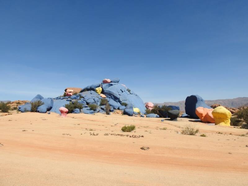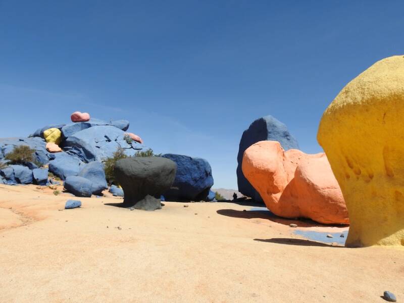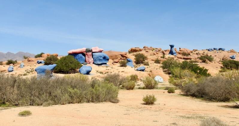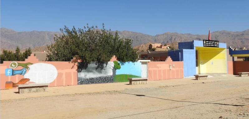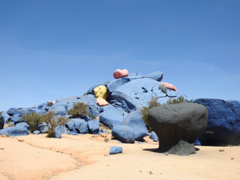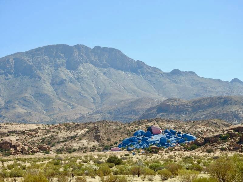 We hebben deze reis de fietsen nog niet gebruikt, dat was vanmorgen wel het geval, Henk en Marita gingen een rondje rondom de Roches Peintes fietsen en wij zijn meegegaan. Eerst een stukje over de asfaltweg, althans wat er van over was en daarna via een betonnen pad omhoog richting de rotsen. Even leek het of de versnelling van Everdien’s fiets niet goed werkte, maar dat was gelukkig loos alarm. Het eerste deel van de toch was al mooi, je keek in het keteldal waarin Tafraout ligt. Daarna was het piste rijden naar de blauwe rotsen, door een landschap vol met heerlijk geurende bruidsbezem struiken afgewisseld met een enkele bloeiende amandelboom. Prachtige rotsformaties om ons heen, des te mooier omdat het de eerste keer was dat we daar fietsten. Toen kwamen de blauwe rotsen, Les Roches Peintes, dus eigelijk geverfde rotsen , in zicht. Dit is landschapskunst van de Belg Jean Verame die dit kunstwerk gecreëerd heeft in 1985, oorspronkelijk met waterverf dat in de loop der tijd langzaam verdween en het is nu overgeschilderd omdat men dit kunstwerk, dat bekend is bij Marokkoreizigers , wil behouden.