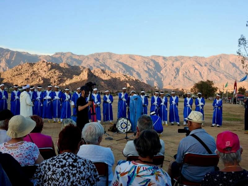 Maar vanavond om 18.00 uur klonken er af en toe luide knallen van het terrein waar de Fantasia altijd wordt gehouden, dat zal wel zondag zijn want een programma hebben we nog niet gezien. Maar Everdien zei om 19.00 uur laten we nu meer eens voor het eten daar naar toe gaan, wie weet. Omdat het nog licht was en de eerste zwoele avond in `Tafraout, kleedden we ons snel om en warempel, het bleek dat de Fantasia nu aan de gang was. Er was een dansgroep van mannen in het blauw, nou dansen , meer monotoon ritmisch bewegen op dito gezang. Later ook een trommelgroepje en dit alles ter omlijsting van de Fantasia: mannen op een Berber paard galopperen in een brede rij waarop ze tegelijkertijd een geweer ( musket) laten knallen, zodat het klinkt als één luide knal, wat lang nadordert in de bergen. En er werden gratis thee en crêpes uitgedeeld en Ahmed de bakker zag zijn kans schoon om kokosmakronen aan de man/vrouw te brengen.
