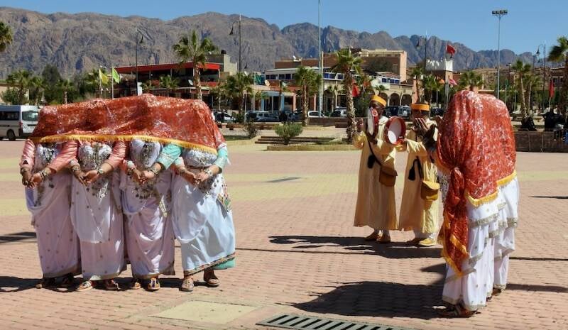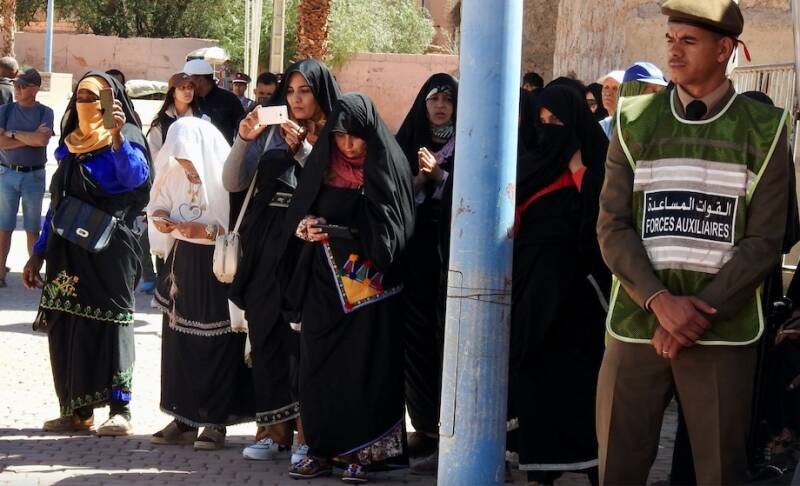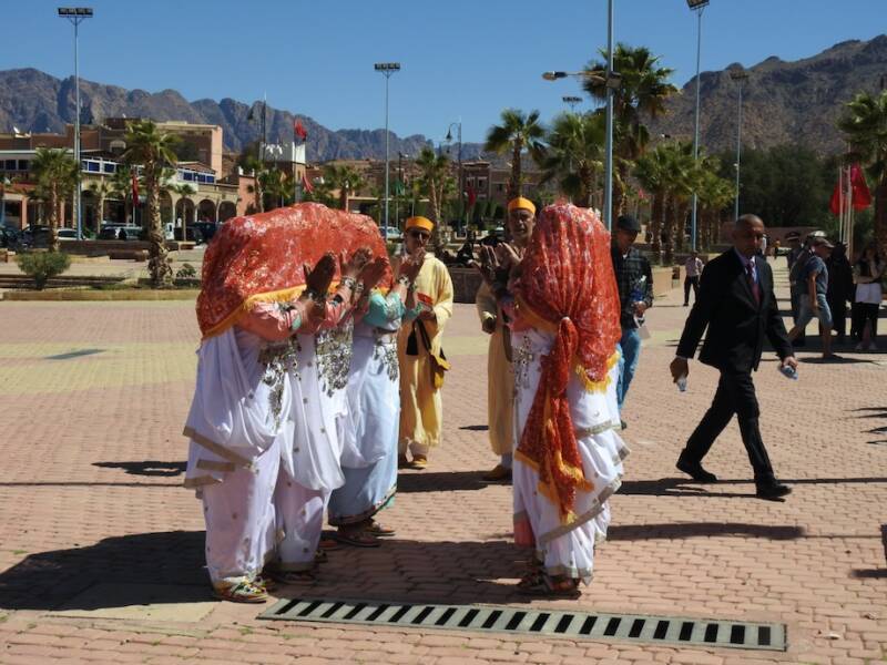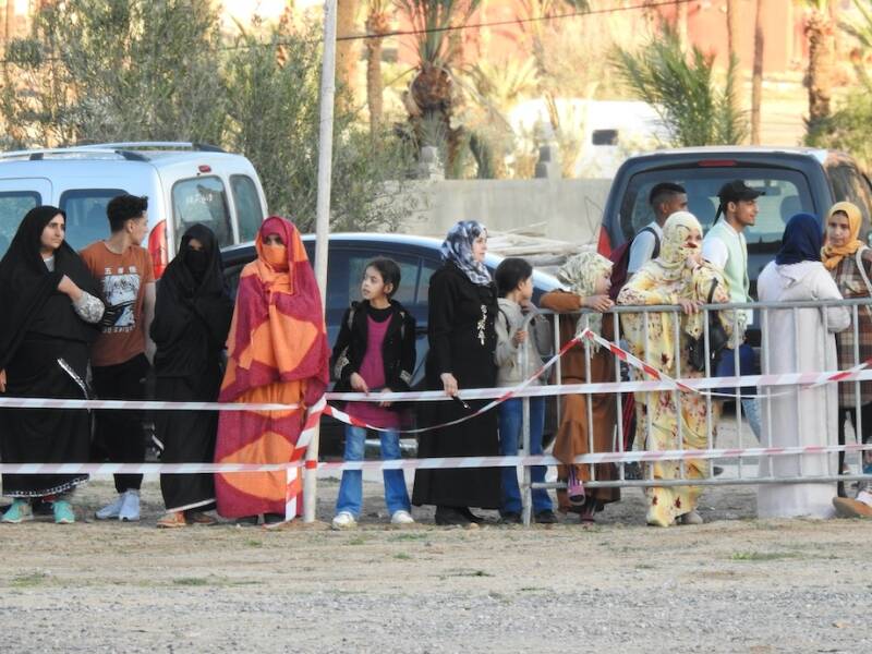 Vanmorgen hebben we een deel van de officiële opening meegemaakt. In afwachting van de komst van de notabelen, allerlei functionarissen van de provincie, trad er een groepje trommelaars op. De standjes met streekproducten werden ingericht en er waren veel politieagenten militairen aanwezig. We liepen richting postkantoor toen we sirenes van politieauto’s hoorden en de politieagenten langs de weg in de houding sprongen. Voorafgegaan door 3 politieauto’s kwamen er maar liefst 28 auto’s met notabelen aangescheurd die vervolgens stopten bij het feestterrein. Teruggekomen van het boodschappen doen was er een vrouwelijke dansgroep, die we andere jaren ook dezelfde act hadden zien opvoeren, een dans door 2 groepen vrouwen met een sjaal waaronder een groep vrouwen van 4 personen schuil ging met het bovenlichaam. Onder de andere sjaal waren trouwens 3 vrouwen verborgen. Af en toe kwamen er wat hoogwaardigheidsbekleders uit de tent gelopen die naar het provinciehuis gingen. Er was nog niet veel publiek aanwezig, dat komt nog wel in de loop van de dag en vooral vanavond.