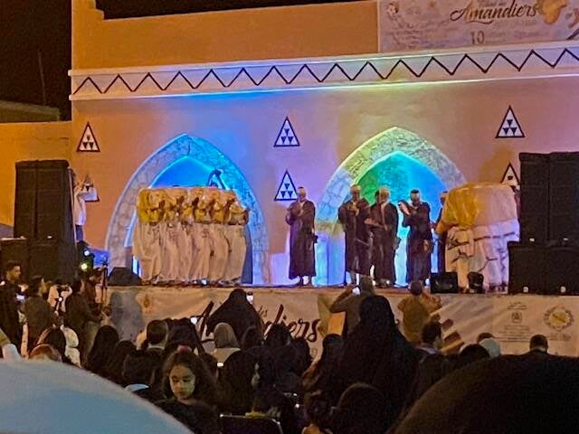 Buiten liepen we bijna letterlijk Henk en Marita tegen het lijf, zij wilden een drankje gaan drinken bij Chez Antoine, iets waar we ook wel oren naar hadden. Dus streken we, even weg van het feestgedruis, neer op het terras van het hotel waar we een fles wijn bestelden. Tot onze verrassing was de heerlijke wijn die we al eerder gedronken hadden niet Marokkaans maar Spaans en ook nog eens uit het goedkopere segment ook nog. Een foto gemaakt van het etiket voor op de terugweg in Spanje. Het was uitermate gezellig, zeker toen we nog een 2e fles wijn hadden laten aanrukken. ( 120 MAD per fles, in Nederland op een terras betaal je toch gauw 3 à 4x zo veel) De tijd vloog voorbij en het was al na elven toen we weer naar het feestterrein liepen en onderweg door een drietal pubers werden aangesproken waarvan er een wel heel vloeiend Engels sprak en erg leergierig bleek naar van alles en nog wat over Nederland over oa drugs en de koning.. Als ex docent vond ik op mijn beurt interessant om het even over Marokko te hebben, m.n. over politiek en de koning, mijn andere metgezellen werden ongeduldig die wilden naar het podium. Of ik op Instagram zat, nee, deze Boomer gaf zijn e-mailadres , helemaal voorbijgaand aan het feit dat natuurlijk Whats app een betere manier van communiceren biedt. Dat dan altijd nog, eerst maar eens een mailtje afwachten, het enthousiasme kan ook in het moment van ontmoeten hebben gelegen.
