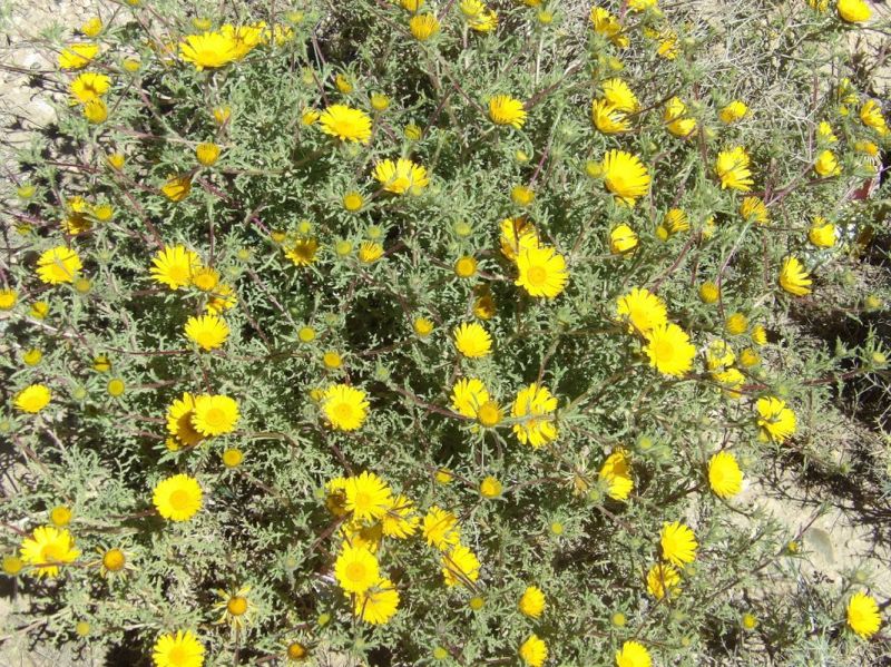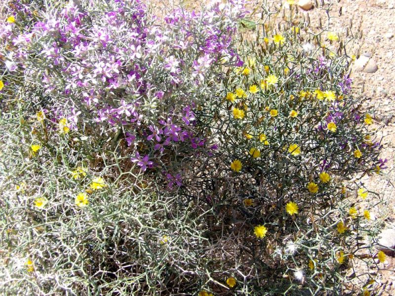 Daarna zijn we 17 km de steeenwoestijn ingereden waarvan de laatste 6 km piste was. Het landschap is erg mooi, steppeachtig in een laagvlakte met wat lage bomengroei. Normaal is het dor en droog en groeit er behalve de bomen niets, nu wat gras en bloemen, voornamelijk geel.
