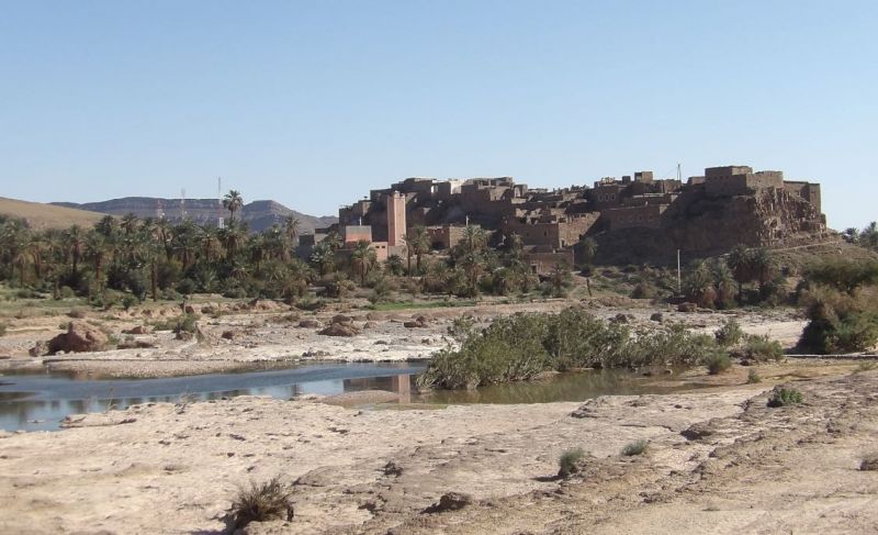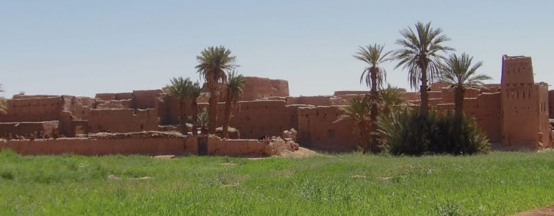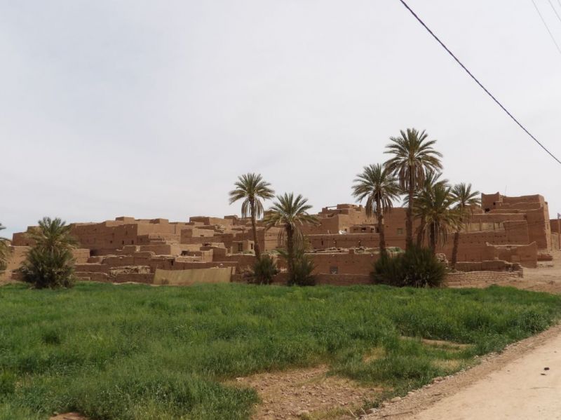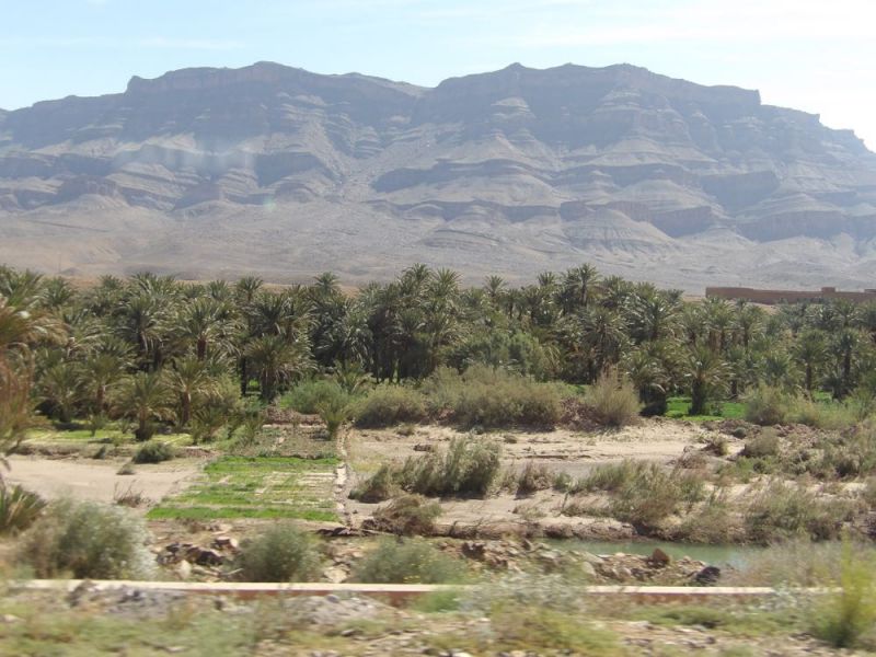 Aan deze kant van de Draâ zijn uitgestrekte palmbossen voordat de zanderige woestijn begint, onder de palmbomen zijn akkertjes die bevloeid worden en waar het groenvoer voor het vee weelderig groeit. Meermalen krijgen we te horen dat ondanks de schaduwzijde van de overstromingen, de regen toch ook vooral een zegen is voor deze regio, er groeit weer wat en de beesten hebben wat te eten.