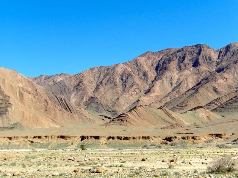 Zag je eerst velden met gele bloemen en wat bloeiende amandelbomen, later was het erg mooi door de bergen met plooiingsgesteente. Daarna kom je op de R109 die tot de mooiste routes van Marokko wordt gerekend. Het landschap is werkelijk fantastisch, je rijdt door een breed dal en de bergen links en rechts verschillen van vorm en keur. Er zitten prachtige patronen in alsof een kunstenaar die met een reusachtige kam heeft aangebracht, graancirkels verbleken hierbij.