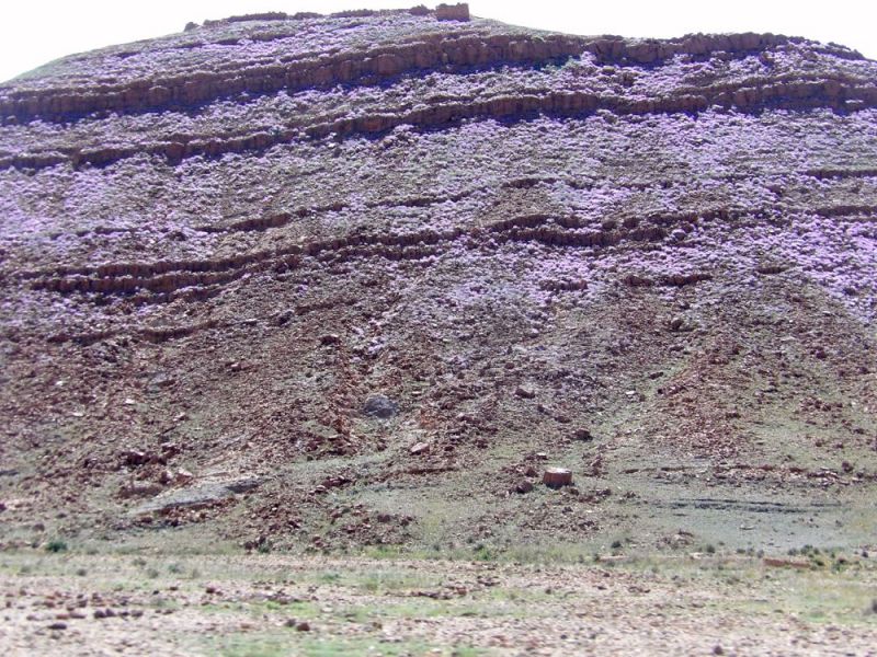 Doordat het 2 maanden geleden zo overvloedig heeft geregend zie je overal bloemen, echt genieten. Dichterbij Tata kleuren de berghellingen paars door de bloemenpracht.