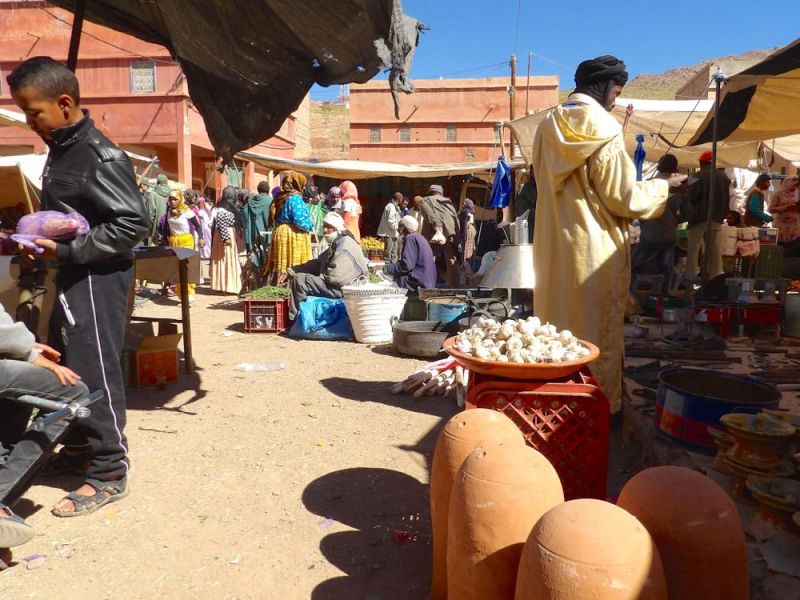 De route naar Alnif voerde weer door een aantrekkelijk landschap, mooi gevormde bergen en veel bloemen langs de weg. Ok Alnif staat bekend om zijn trilobieten die hier in de omgeving gevonden worden en wat trivialer, ook om zijn uitstekende kwaliteit aardappelen, de beste van Marokko, al konden we bij een eerder bezoek aan Alnif geen verschil proeven. En omdat hier op vrijdag de souk is, konden we onze voorraad weer mooi aanvullen.