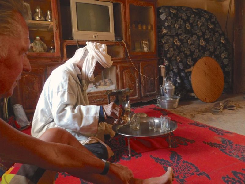 De oude kashba, was een versterkt lemen dorp waar een oude man ongevraagd als gids op trad. Hij liet ons zijn huis zien, we kregen thee, werden niet misselijk en bedanken de man waarbij we hem wat dirhams in de hand drukten. Nu kon hij daar wel 6 broden voor kopen, het werd geteld, hij vroeg om meer, nee dank u, we hebben niet om een gids gevraagd.