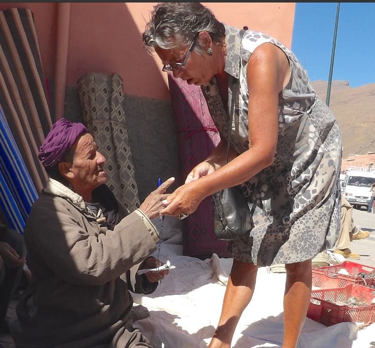 We kwamen in de stad een paar keer iemand tegen die ons nog van andere jaren kende, zo ook de eigenaar van een camping in Ouled Driss, vlakbij Mhamid. Ook hij vertelde dat er dit jaar weinig toeristen waren. Hij troonde ons mee naar zijn winkeltje , die hij bezit in het centrum van Zagora,om ons ringen te laten zien. Hij had er genoeg maar geen bijzondere, in die zin dat we er een wilden kopen.