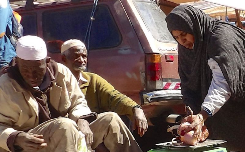 Maar door de donkergekleurde bewoners , de kleurrijke gewaden bij de vrouwen, de mannen met vaak witte djellaba’s en tulbanden, doet het Afrikaans aan.