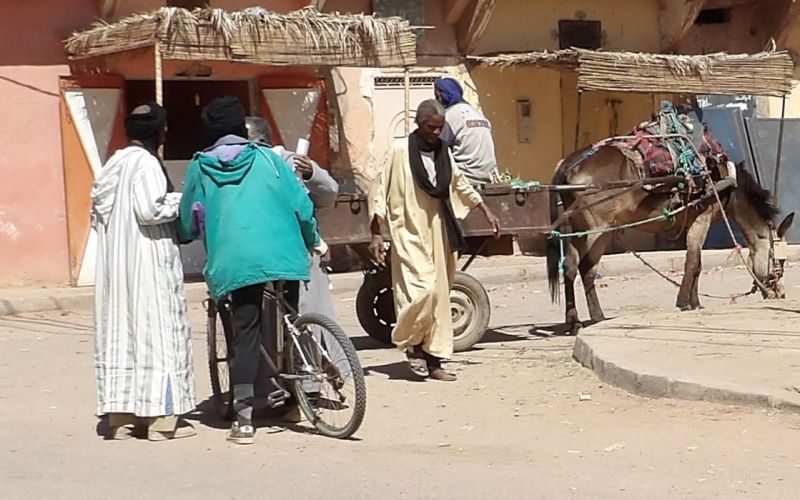 Vanaf de parking die vlak aan de weg is, zien we mooi het dagelijks leven in Tamegrout aan ons voorbij schuiven waarbij opvalt dat de ezel hier nog veel als vervoer- en als transportdier gebruikt wordt.